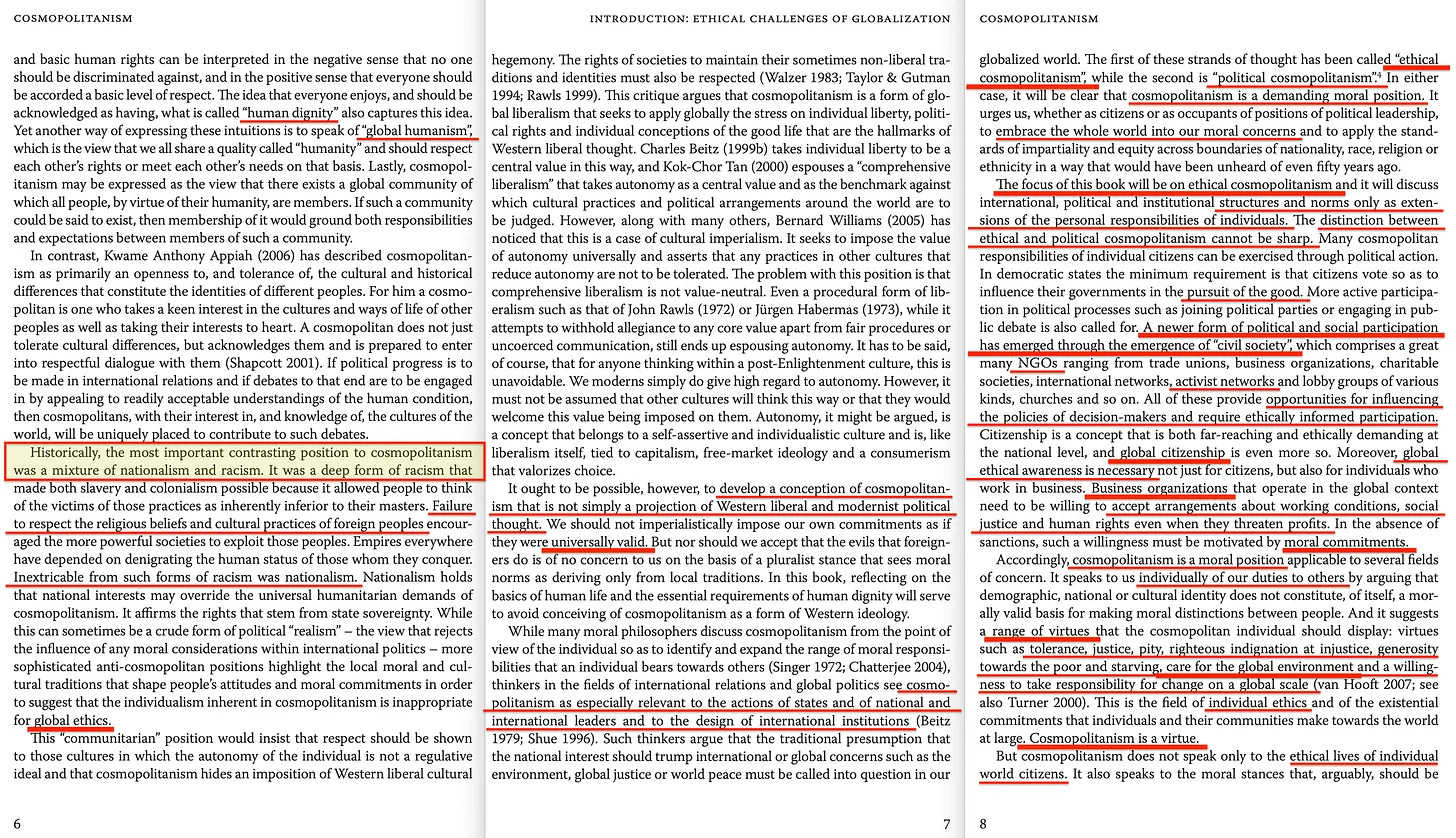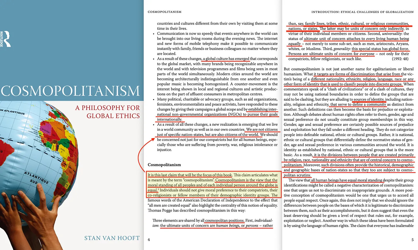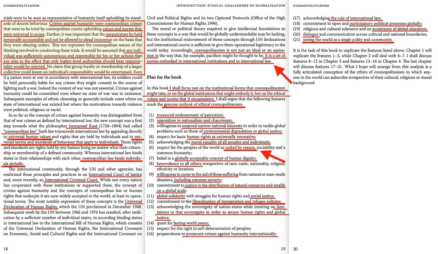 «Το επίκεντρο αυτού του βιβλίου θα είναι ο ηθικός κοσμοπολιτισμός και θα συζητήσει τις διεθνείς, πολιτικές και θεσμικές δομές και νόρμες μόνο ως επεκτάσεις των προσωπικών ευθυνών των ατόμων»....