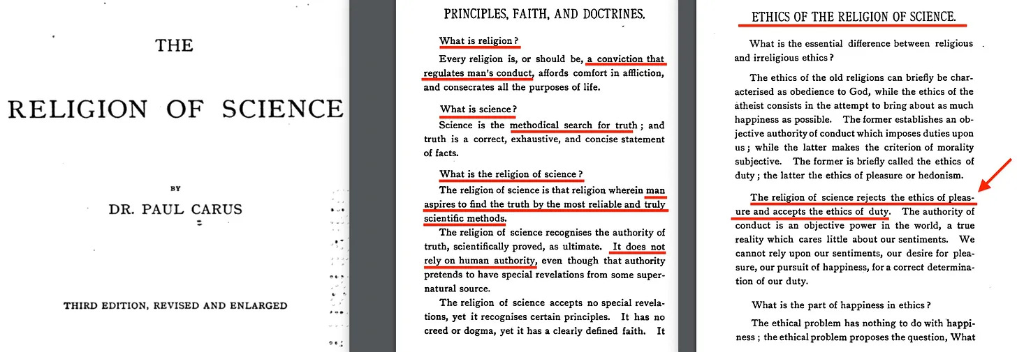 Ακολουθούν περισσότερες λέξεις-κλειδιά που θα μπορούσα να αναπτύξω, αλλά δεν βλέπω το νόημα - με μία εξαίρεση, την «ενωμένοι από τη λογική». Αυτό είναι ουσιαστικά επιστημονικός ορθολογισμός. Και αυτό περιγράφει ουσιαστικά τη Θρησκεία της Επιστήμης [32] του Paul Carus, η οποία «απορρίπτει ρητά την ηθική της ηδονής και αποδέχεται την ηθική του καθήκοντος». Ο Paul Carus, επιπλέον, ήταν [33] ένας [34] μασόνος [35], ο οποίος τυχαία προήδρευσε του Παγκόσμιου Κοινοβουλίου των Θρησκειών του Κόσμου το 1893.