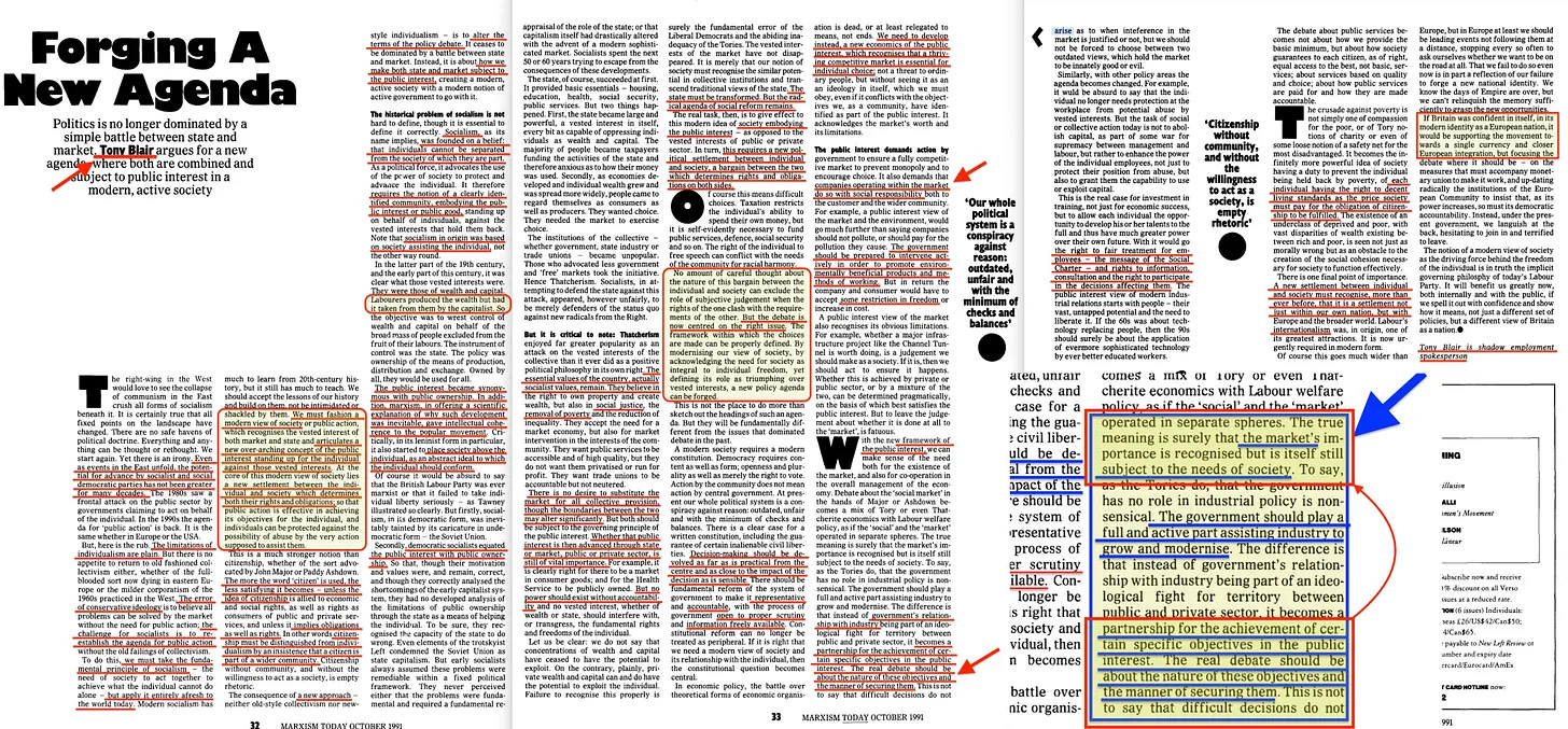 Ο Blair το 1991 μίλησε επίσης για την αναδιαμόρφωση του ατόμου ως «πολίτη» στο άρθρο του το 1991 στο Marxism Today [19] (που καλύπτεται στο «The Third Way»-Τρίτο Δρόμο- παραπάνω), αναφερόμενος στη χρήση του ως ένα λεπτό ρητορικό μέσο για την απόδοση ευθυνών στο άτομο. Το άρθρο αυτό ζητούσε επίσης τη συνεργασία του δημόσιου και του ιδιωτικού τομέα (ΣΔΙΤ) για το κοινό καλό, κάτι που μπορεί να συνδεθεί με τη γενική έννοια του κορπορατισμού [20] (που δεν πρέπει να συγχέεται με την κορπορατοκρατία [21]) – αν και η συγκεκριμένη εφαρμογή που επιδιώκουν επί του παρόντος είναι μια προσαρμοσμένη εκδοχή, σε στενή συνάρτηση με τη Νέα Οικονομική Πολιτική του Λένιν.