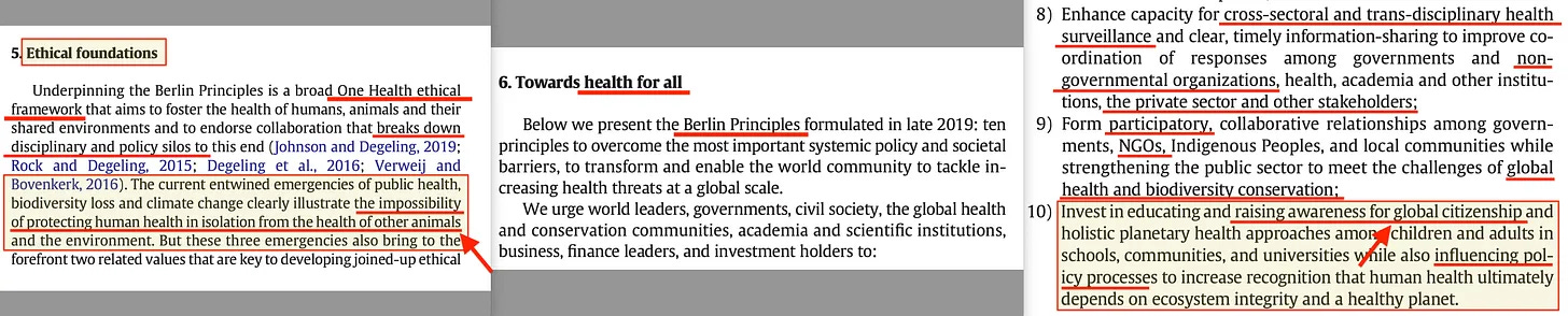 Παρεμπιπτόντως, οι Αρχές του Βερολίνου αναφέρονται σε ένα «ευρύ ηθικό πλαίσιο της Ενιαίας Υγείας (One Health)» - το οποίο φαίνεται κατάλληλο δεδομένου του τίτλου του βιβλίου - το οποίο καλεί περαιτέρω σε «συνεργασία που καταρρίπτει τα στεγανά μεταξύ των επιστημονικών κλάδων και των πολιτικών» και -