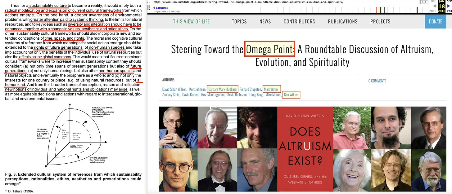 Και - όπως είδαμε προηγουμένως μέσω του Leo Swidler - η «Παγκόσμια Ηθική» βασίζεται σε «βασικές αρχές» που συσχετίζονται στενά με τον κολεκτιβισμό και σε «μεσαίες αρχές» που σχετίζονται με τα «δικαιώματα έναντι των ευθυνών». Και όλα αυτά μας οδηγούν στον Ken Wilber, του οποίου το AQAL είναι μια δισδιάστατη εφαρμογή των δικαιωμάτων και των ευθυνών στον χρονικό και χωρικό τομέα. Προσθέστε την ανησυχία για τη φύση - όπως έκανε αρχικά ο David Tabara [39] το 1999 - και μένετε με έναν τρισδιάστατο «μηχανισμό καθοδήγησης» που πιστεύουν ότι θα μας οδηγήσει στο Σημείο Ωμέγα και, συνεπώς, στην Συνειδητή Εξέλιξη της Barbara Marx Hubbart.