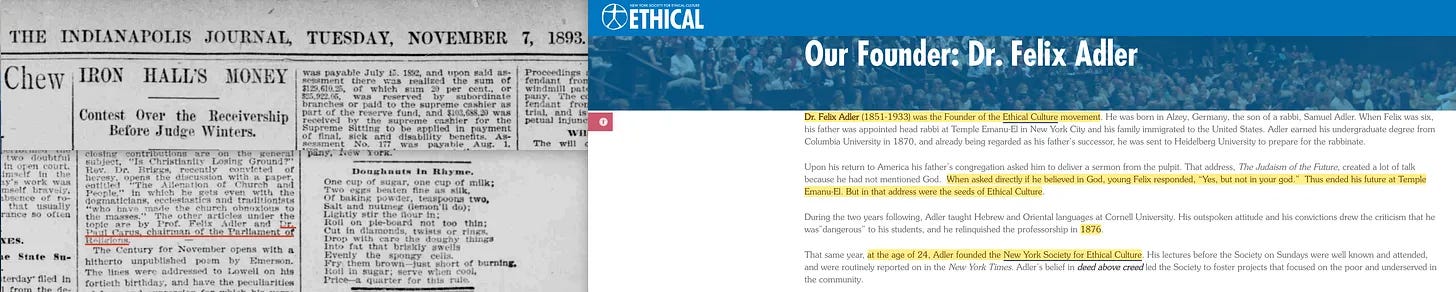 Όχι, αλήθεια. Εδώ είναι36, ακριβώς κάτω από τον Felix Adler, ο οποίος ίδρυσε την Εταιρεία Ηθικής Κουλτούρας της Νέας Υόρκης το 1876 [37].