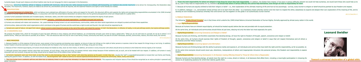 ... προσθέτουμε «δικαιώματα και ευθύνες» στο μείγμα (τις «μεσαίες αρχές» που οδηγούν στην «Παγκόσμια Ηθική», σύμφωνα με τον Leo Swidler [17]... οι οποίες βασίζονται στις «βασικές αρχές» του κολεκτιβισμού... α, και επίσης - ο Swidler και ο Hans Kung συνεργάζονταν συχνά, δηλαδή, «Μια Παγκόσμια Ηθική» παραπάνω)