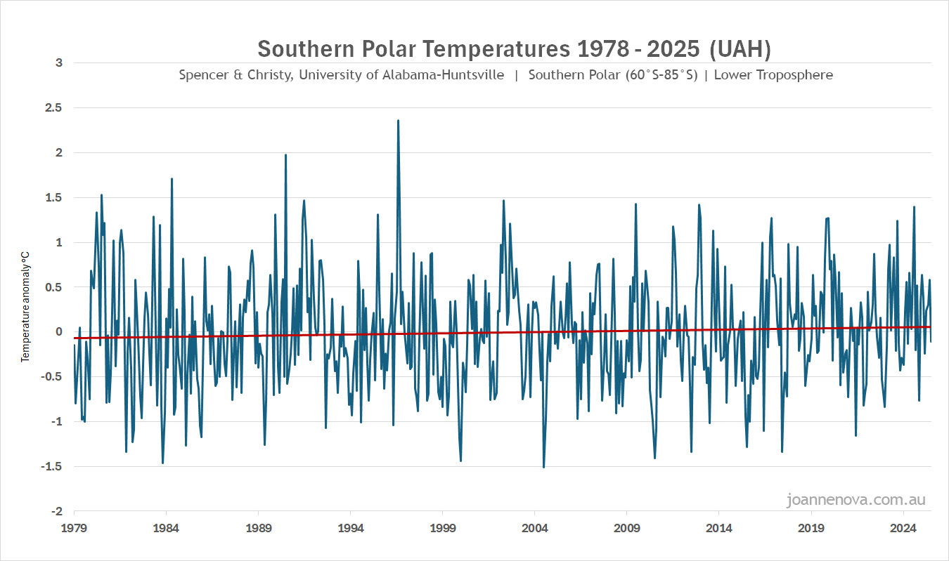 Η τάση του δορυφόρου UAH για την Ανταρκτική τα τελευταία 45 χρόνια ήταν μόλις 0,03 °C θέρμανση ανά δεκαετία. Δεδομένου ότι οι πιγκουίνοι Emperor επιβιώνουν σε θερμοκρασίες από -60 °C έως 20 °C, οι πιγκουίνοι σήμερα δεν θα ενδιαφέρονταν καθόλου για ένα αξιολύπητο επιπλέον δέκατο του βαθμού που κατανέμεται σε σχεδόν 50 χρόνια.