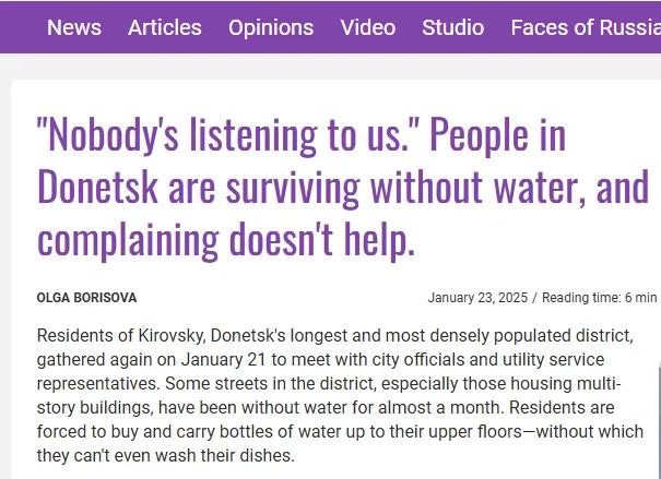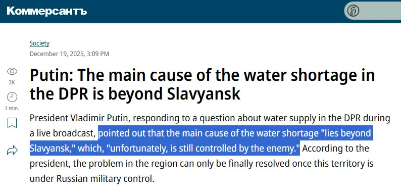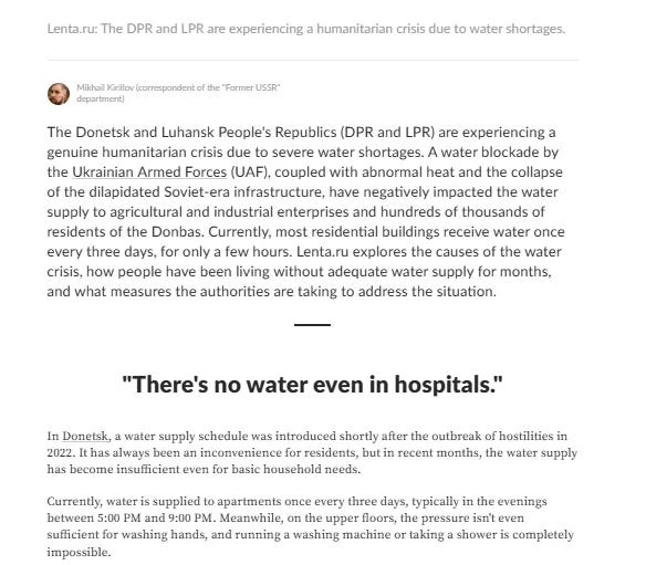 Όσο για την ασφάλεια των κατοίκων του Ντόνμπας -που υποτίθεται ότι είναι ο σκοπός της SMO-, θα πρέπει να κάνουν υπομονή. Είναι αλήθεια ότι είναι δύσκολο να κάνεις υπομονή όταν δεν έχεις νερό, αλλά θα τα καταφέρουν.