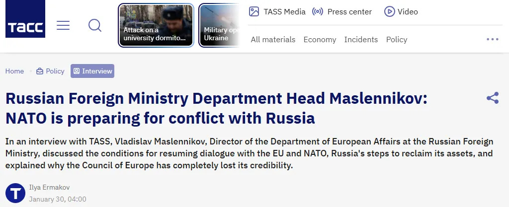 Το Κρεμλίνο υπήρξε μόνο ανιδιοτελές και ευγενικό απέναντι στο ΝΑΤΟ, και πού είναι η ευγνωμοσύνη; Η Ρωσία συνεχίζει να πουλάει τους φυσικούς της πόρους στο ΝΑΤΟ, ακόμη και όταν το ΝΑΤΟ «προετοιμάζεται για μια σύγκρουση με τη Ρωσία» (πηγή: Υπουργείο Εξωτερικών της Ρωσίας στις 30 Ιανουαρίου 2026).