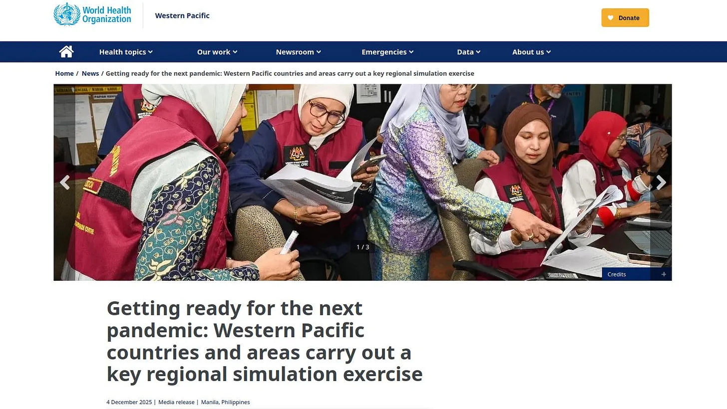 Στα τέλη του περασμένου έτους, ο Παγκόσμιος Οργανισμός Υγείας (ΠΟΥ) διεξήγαγε την τελευταία επανάληψη της «Άσκησης Κρύσταλλο» με «31 χώρες και περιοχές από όλη την Περιφέρεια Δυτικού Ειρηνικού του Παγκόσμιου Οργανισμού Υγείας (ΠΟΥ) ... σε μια ετήσια άσκηση προσομοίωσης για να ελέγξουν την ετοιμότητά τους για την επόμενη πανδημία».