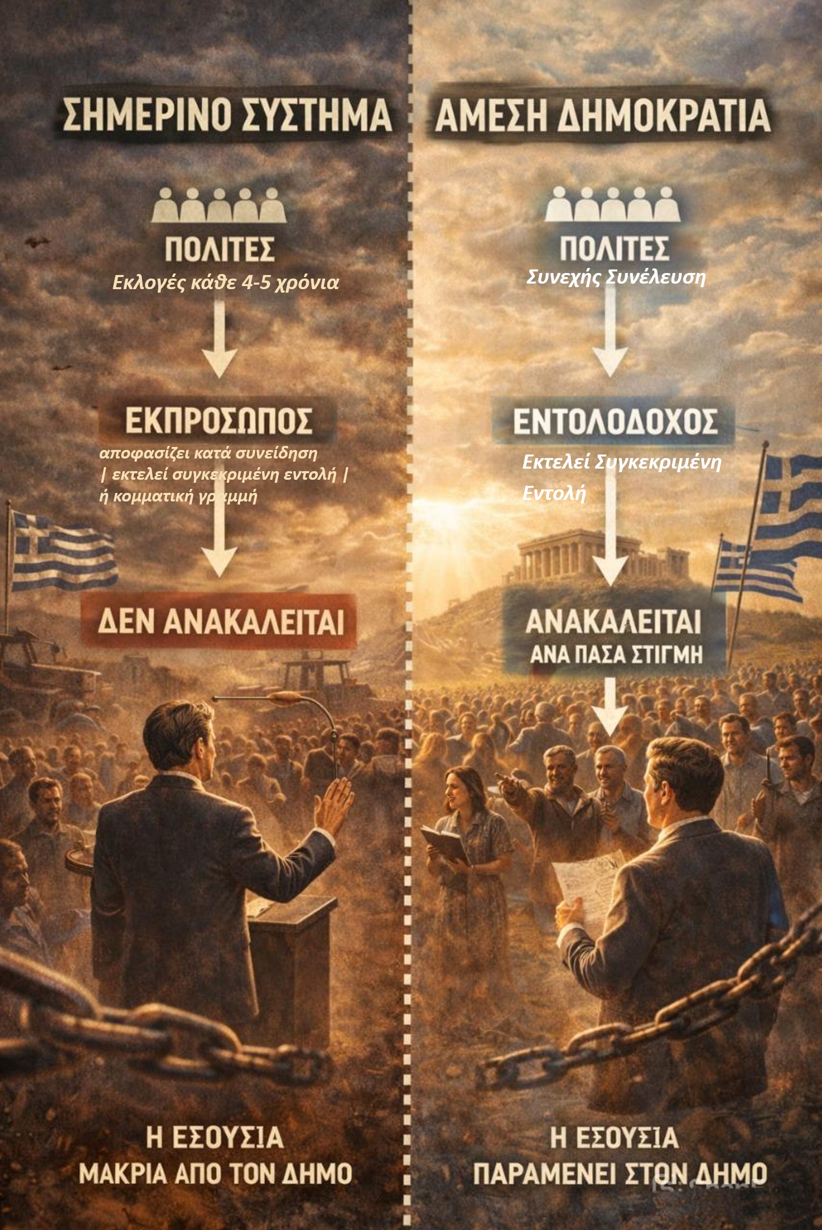 Απέναντι σε αυτή την πραγματικότητα, η Άμεση Δημοκρατία δεν προτείνεται ως ουτοπία ούτε ως ρομαντική επιστροφή στο παρελθόν. Προτείνεται ως μια ριζικά διαφορετική αντίληψη για την εξουσία. Ως η επαναφορά της πολιτικής στο φυσικό της υποκείμενο: τον Δήμο, το σύνολο των πολιτών. Στην Άμεση Δημοκρατία, η εξουσία δεν ανατίθεται· ασκείται. Δεν προσωποποιείται· διαχέεται. Δεν συσσωρεύεται· ελέγχεται διαρκώς.