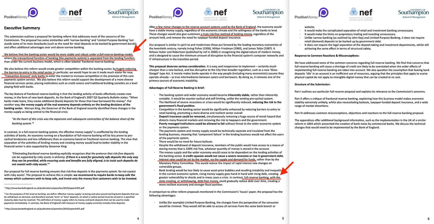 Με άλλα λόγια, το Positive Money προτείνει την εισαγωγή ενός νέου τύπου χρήματος με ποσοστό αποθεματικού 100% [5]. Ουσιαστικά, στο πλαίσιο του «κατανεμημένου» χρήματος, αυτό σημαίνει τη μεταφορά της διαδικασίας δημιουργίας χρήματος από τις τράπεζες και τα χρηματοπιστωτικά ιδρύματα στην κεντρική τράπεζα.