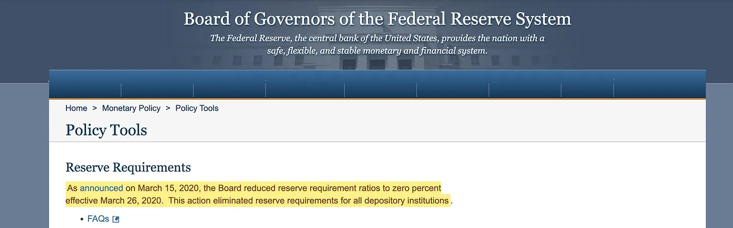 Ιστορικά, οι κεντρικές τράπεζες επέβαλαν απαιτήσεις αποθεματικών, περιορίζοντας το ποσό των χρημάτων που μπορούσαν να δανείσουν οι τράπεζες. Ωστόσο, το 2020, με την έναρξη της υποτιθέμενης πανδημίας, ο δείκτης αποθεματικών ορίστηκε στο 0% [4], καταργώντας ουσιαστικά την απαίτηση.