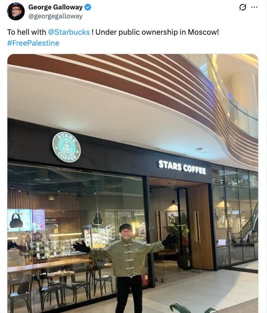 Υποθέτω ότι ο ίδιος ο George υπέθεσε ότι επειδή ο Πούτιν φέρεται να χρηματοδοτεί τα τούνελ της Αντίστασης κάτω από τη Γάζα ή οτιδήποτε άλλο, ο καφές Stars πρέπει να είναι το αντίθετο του καφέ Starbucks, ο οποίος είναι φιλοσιωνιστικός.