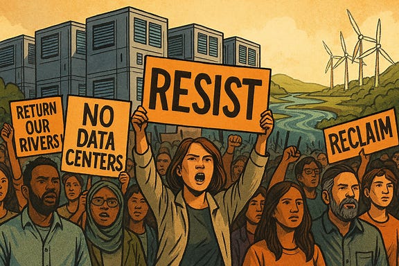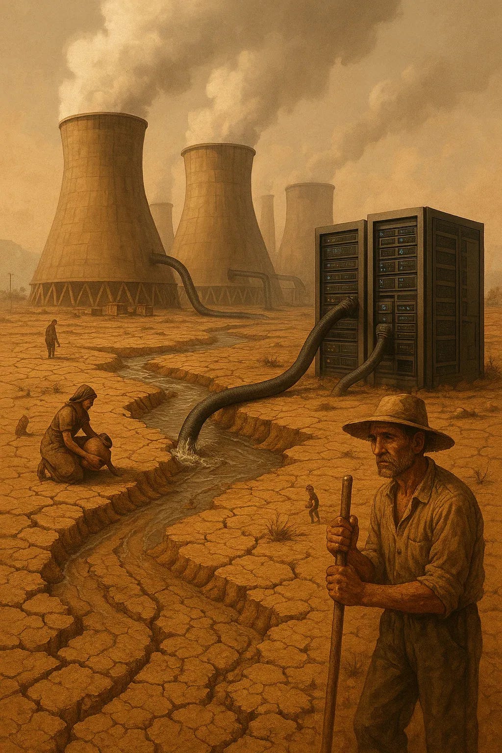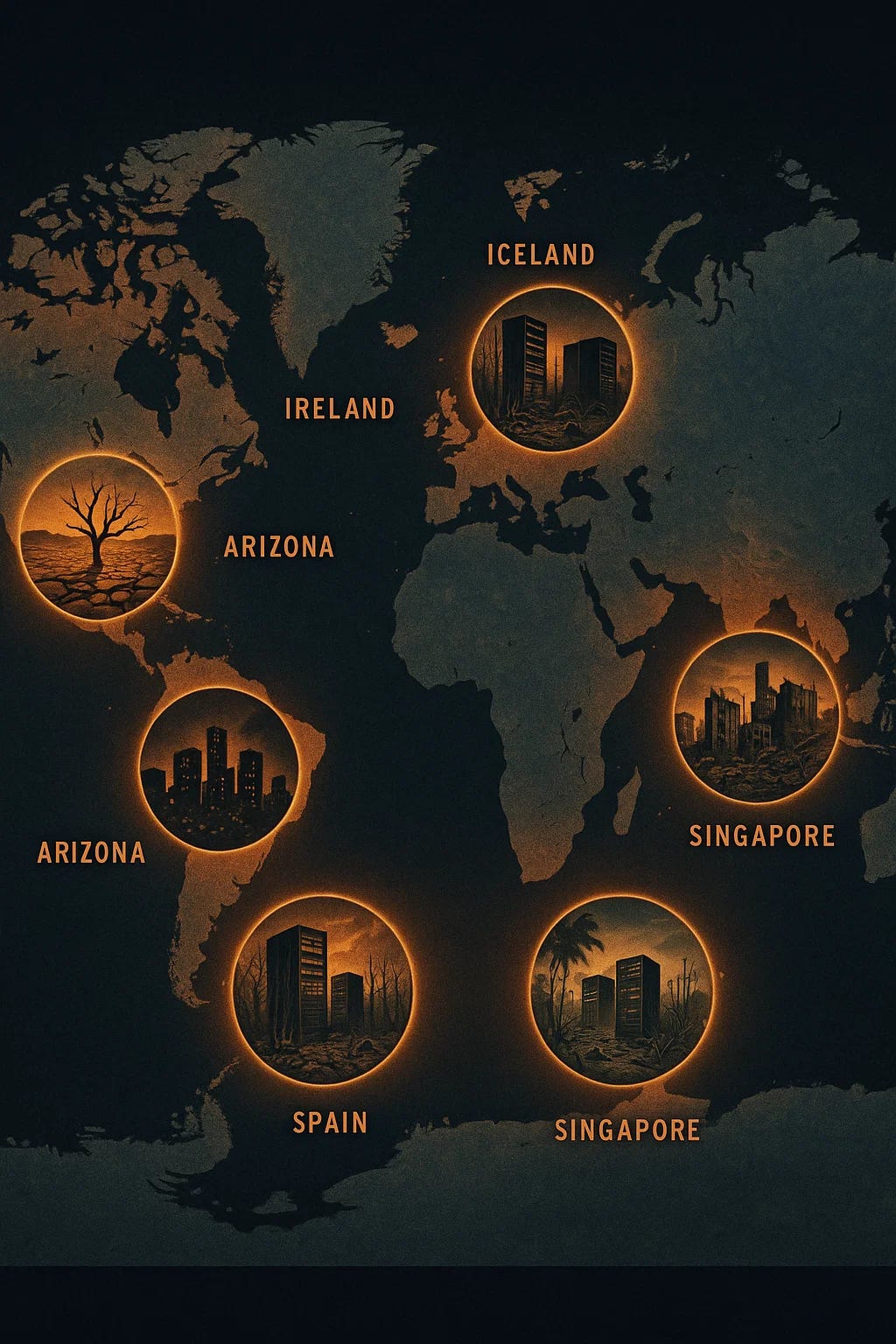 Αυτός ο ανταγωνισμός δεν είναι αφηρημένος — ήδη συμβαίνει στην Αριζόνα, την Ισπανία και την Ιρλανδία. Η επέκταση των κέντρων δεδομένων αντιπροσωπεύει οικολογική αποικιοκρατία, όπου η εταιρική υποδομή έχει προτεραιότητα έναντι της επιβίωσης του ανθρώπου.
