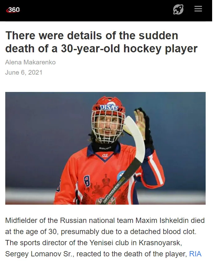 Ένα μήνα αργότερα, ένας θρόμβος αίματος στέρησε τη ζωή του 30χρονου Maxim Ishkeldin, μέλους της εθνικής ομάδας χόκεϊ της Ρωσίας.