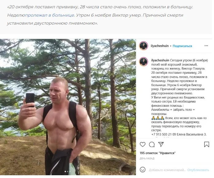 Πολλοί από αυτούς είναι πολύ νέοι -18, 19, 21 ετών. Σε ορισμένες περιπτώσεις, ο Τύπος έγραψε ανοιχτά ότι οι θανόντες ήταν "εμβολιασμένοι" και υποψιάστηκε αιτιώδη σχέση μεταξύ εμβολιασμού και θανάτου. Σε πολλές περιπτώσεις, δεν υπάρχουν πληροφορίες σχετικά με τον "εμβολιασμό", αλλά είναι γνωστό ότι σχεδόν όλα τα επαγγέλματα υποβλήθηκαν σε εξαναγκασμό, και οι αθλητές το χρειάζονταν επίσης για να ταξιδέψουν στο εξωτερικό.
