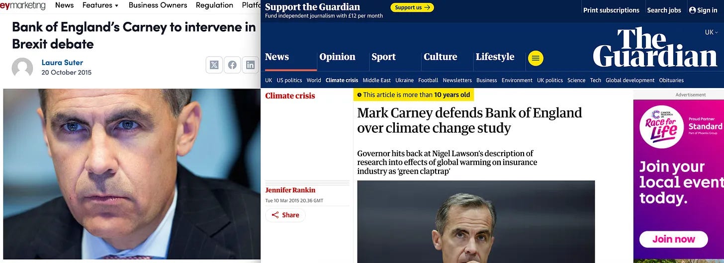 Όμως, όπως ειπώθηκε, και οι πέντε εκθέσεις αλληλεπικαλύπτονται σε μεγάλο βαθμό. Το Chatham και το CFR θα ισχυριστούν, όπως είναι αναμενόμενο, ότι πρόκειται για την προστασία του λαού (ενώ αρνούνται να αναλάβουν την ευθύνη για τις δυσκολίες που προκαλεί ο στρατηγικός τους σχεδιασμός), η Fabian Society θα ενεργήσει ως διαχειριστής της μακροπρόθεσμης οράματος του RIIA (Chatham House), η Τριμερής Επιτροπή θα σχεδιάσει αντιδημοκρατικά πώς να ανταμείψει οικονομικά τον εαυτό της με έξοδα των φορολογουμένων μέσω της προσέγγισης του Τριμερούς Δικτύου, ενώ ο Mark Carney και οι άλλοι κεντρικοί τραπεζίτες θα γιορτάσουν σιωπηλά την καταστροφή της μεσαίας τάξης, αρνούμενοι όμως κατάφωρα να αναλάβουν την ευθύνη, παρότι παρεμβαίνουν κατάφωρα στις εκλογές, στην κλιματική πολιτική και σε άλλες πολιτικές αποφάσεις χωρίς να έχουν καμία δημοκρατική εντολή σε αυτό το θέμα. Και ο Mark Carney πραγματικά ξεχωρίζει εδώ, όχι μόνο επειδή ήταν διοικητής της Τράπεζας του Καναδά και της Τράπεζας της Αγγλίας, αλλά και επειδή παρενέβη ρητά στην ψηφοφορία για το Brexit [10] και άρχισε ενεργά να μιλάει για την προώθηση της κλιματικής πολιτικής — χωρίς η Τράπεζα της Αγγλίας να έχει οποιαδήποτε εξουσιοδότηση να το πράξει. Στην πραγματικότητα, αν υπάρχει ένας άνθρωπος που αξίζει να εξεταστεί διεξοδικά από αυτή την άποψη, αυτός είναι ο ίδιος. Το γεγονός ότι οι Καναδοί μπόρεσαν να εκλέξουν αυτόν τον άνθρωπο σε πολιτικό αξίωμα λέει πολλά για το πόσο διεφθαρμένες έχουν γίνει οι εκλογές, με τον καναδικό δημόσιο ραδιοτηλεοπτικό φορέα να λειτουργεί ουσιαστικά ως όργανο προπαγάνδας για όποιον τον δωροδοκεί. Οι ενέργειες υπό την ηγεσία του Trudeau δεν αφήνουν περιθώρια για παρερμηνείες από αυτή την άποψη.