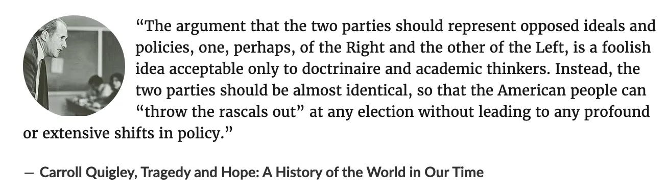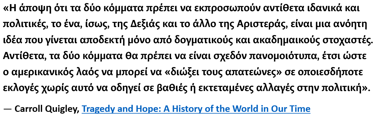 Όσο για όσους από εσάς μεγαλώσατε σε αντιπροσωπευτικές δημοκρατίες, όπου οι πολίτες εκλέγουν εκπροσώπους που στη συνέχεια συζητούν και αποφασίζουν για την πολιτική, και όπου οι πολιτικές τείνουν να αλλάζουν με τα εκλεγμένα κόμματα και οι διαφωνίες είναι νόμιμες, υγιείς και φυσιολογικές… λοιπόν, όλα αυτά θα καταλήξουν να είναι μια παλιά ανάμνηση, όπου αντίθετα τα κόμματα θα κάνουν όσο το δυνατόν περισσότερο θόρυβο για απολύτως ασήμαντα θέματα, ενώ θα στερούν από τα παιδιά σας το μέλλον τους, ακριβώς με τον τρόπο που ο Carroll Quigleyπεριέγραψε τόσο εύστοχα στο βιβλίο του «Τραγωδία και Ελπίδα», που εκδόθηκε τη δεκαετία του ’60 [¹⁶].