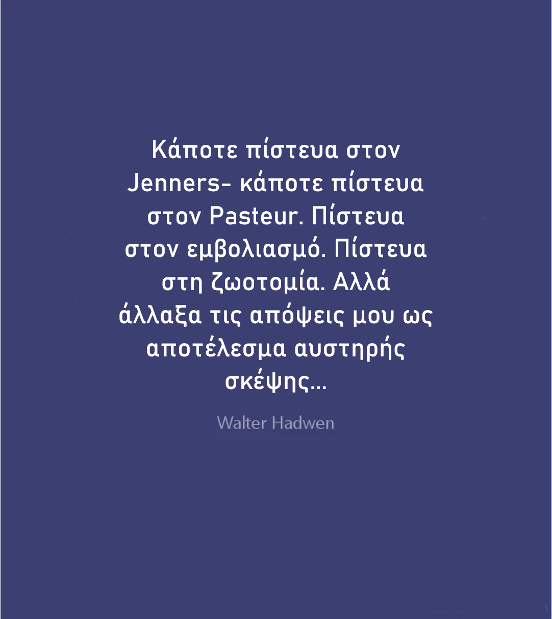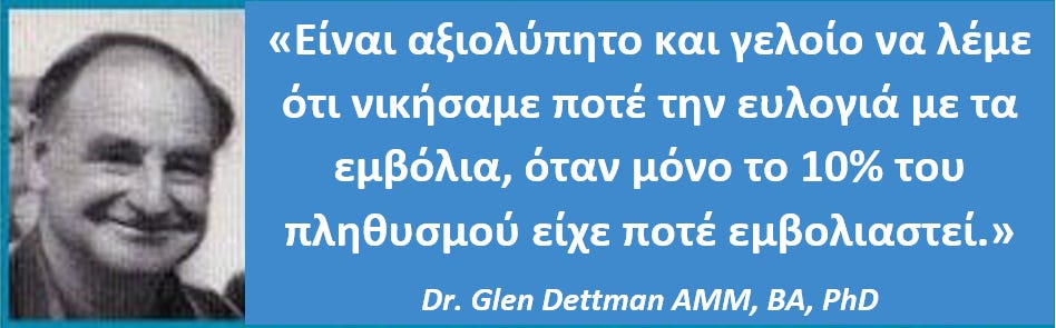 ""Είναι αξιολύπητο και γελοίο να λέμε ότι νικήσαμε ποτέ την ευλογιά με τα εμβόλια, όταν μόνο το 10% του πληθυσµού είχε ποτέ εμβολιαστεί.". - Dr. Glen Dettman AMM, BA, PhD.