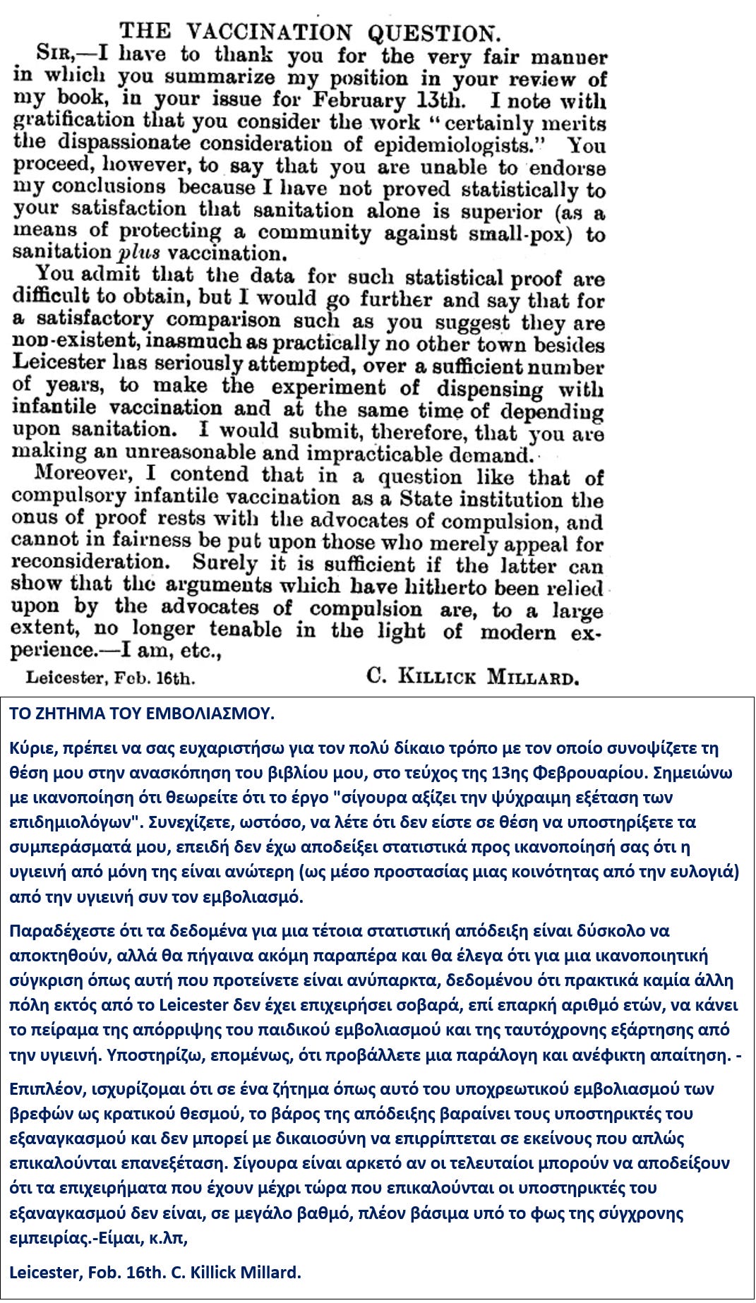 ... Τα εντυπωσιακά γεγονότα ότι στο Leicester, χωρίς βρεφικό εμβολιασμό, η μείωση ήταν μεγαλύτερη από ό,τι στα περισσότερα μέρη και ότι σε ολόκληρη τη χώρα η ευλογιά συνέχισε να μειώνεται παρά την πτώση του εμβολιασμού, θα πρέπει σίγουρα να αποτελούν επαρκή λόγο για εύλογες αμφιβολίες.