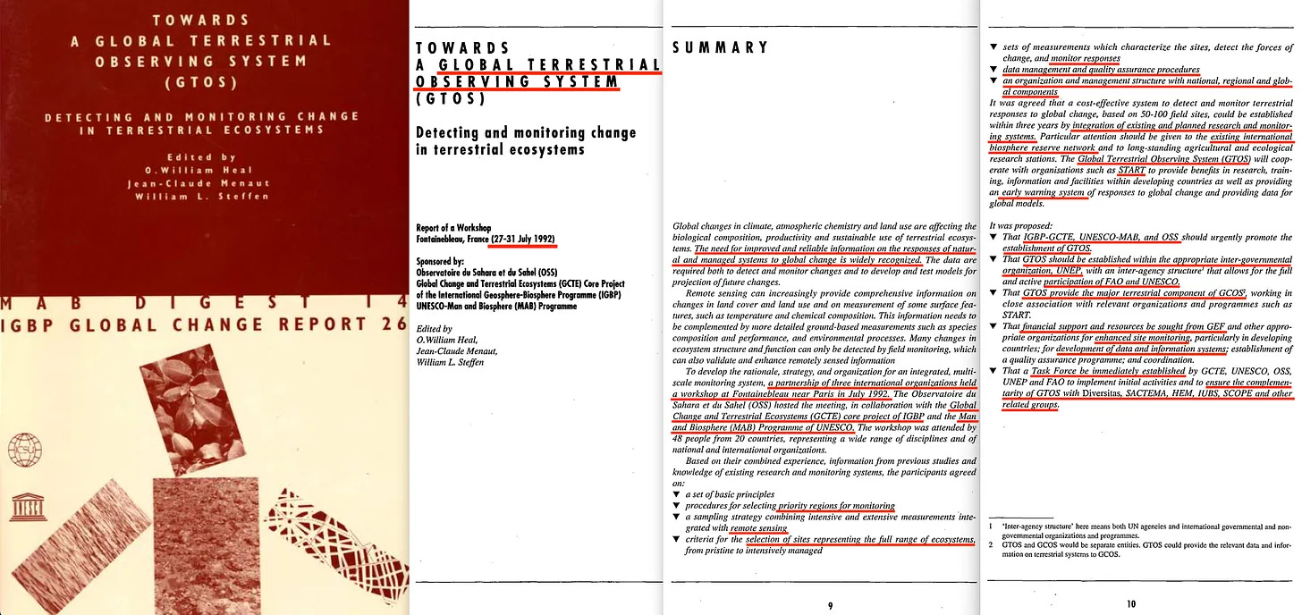 Το 1992, ξεκίνησε η επόμενη πρωτοβουλία, με εκκλήσεις από το Διεθνές Πρόγραμμα Γεώσφαιρας-Βιόσφαιρας για ένα Παγκόσμιο Σύστημα Παρατήρησης της Γης (GTOS), με παρόμοια συστήματα με την ονομασία GCOS (Κλίμα) και GOOS (Ωκεανός). Μαζί, αυτά τα τρία συνέθεσαν το πρόγραμμα με την συντομογραφία GOS, το Παγκόσμιο Σύστημα Παρατήρησης.