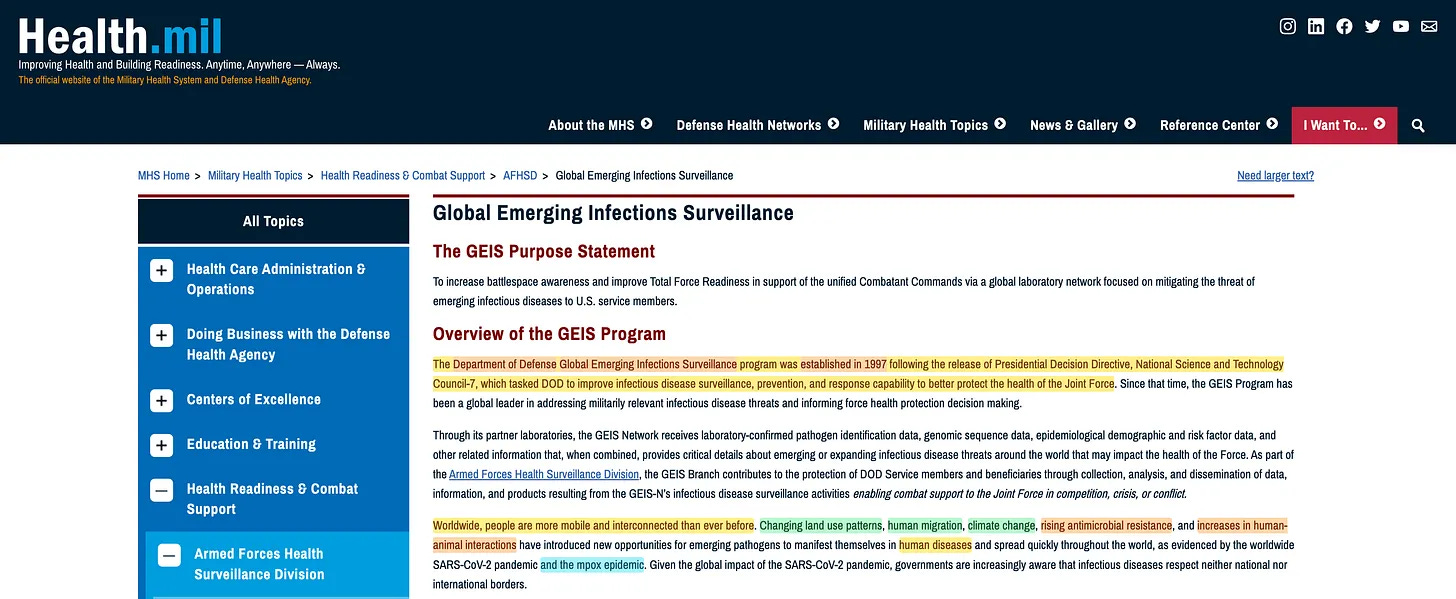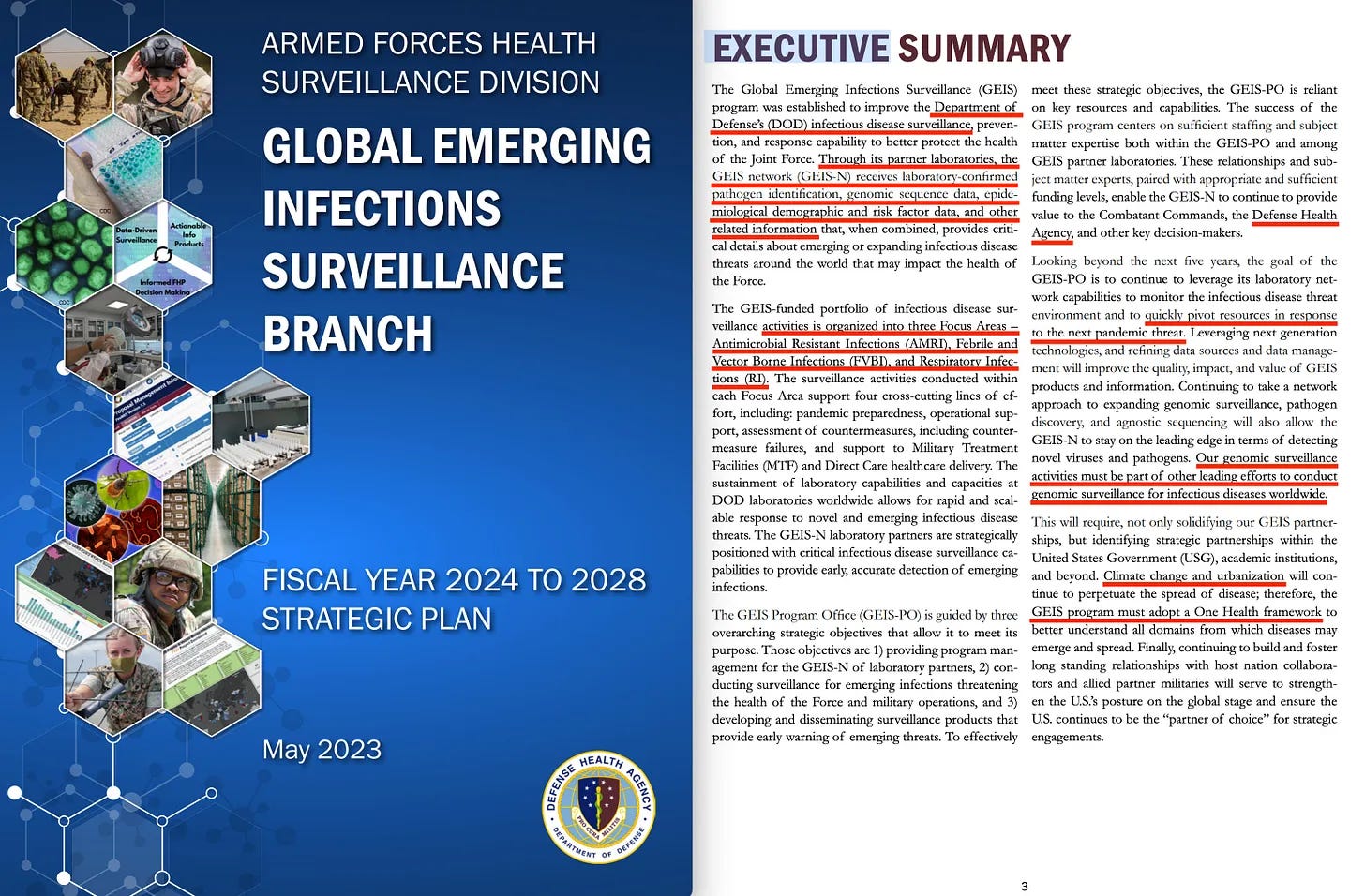 Σε αυτό το πλαίσιο, το GEIS είναι συντομογραφία του «Global Emerging Infectious Surveillance» (Παγκόσμια Παρακολούθηση Αναδυόμενων Λοιμωδών Νοσημάτων) και το 2023 δημοσίευσε ένα σχέδιο που περιγράφει λεπτομερώς τι ακριβώς θα παρακολουθούσε... το οποίο, εν συντομία, ήταν «τα πάντα».