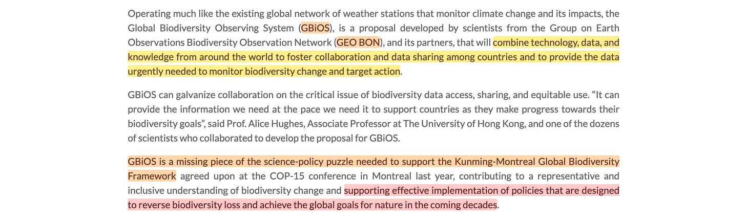 Αλλά ακόμη και αυτό έχει παράγωγα, επειδή ανακοινώθηκε το 2023 GBIOS (Παγκόσμιο Σύστημα Παρατήρησης της Βιοποικιλότητας), μια πρωτοβουλία με συγκεκριμένο στόχο - την αναστροφή της απώλειας βιοποικιλότητας, αναφερόμενη συγκεκριμένα στον εαυτό της ως εξής