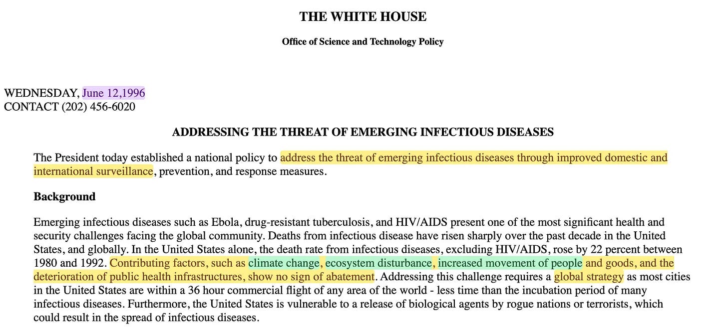 Και γρήγορα προχωράμε στο 1996, με τον Clinton να ανακοινώνει μια νέα πρωτοβουλία - «Αντιμετώπιση της απειλής των αναδυόμενων μολυσματικών ασθενειών» - με σκοπό την προστασία μας από τις αναδυόμενες ασθένειες, και μέχρι το 1997, το Υπουργείο Άμυνας είχε ξεκινήσει την πρωτοβουλία. Έτσι γεννήθηκε το DoD-GEIS.