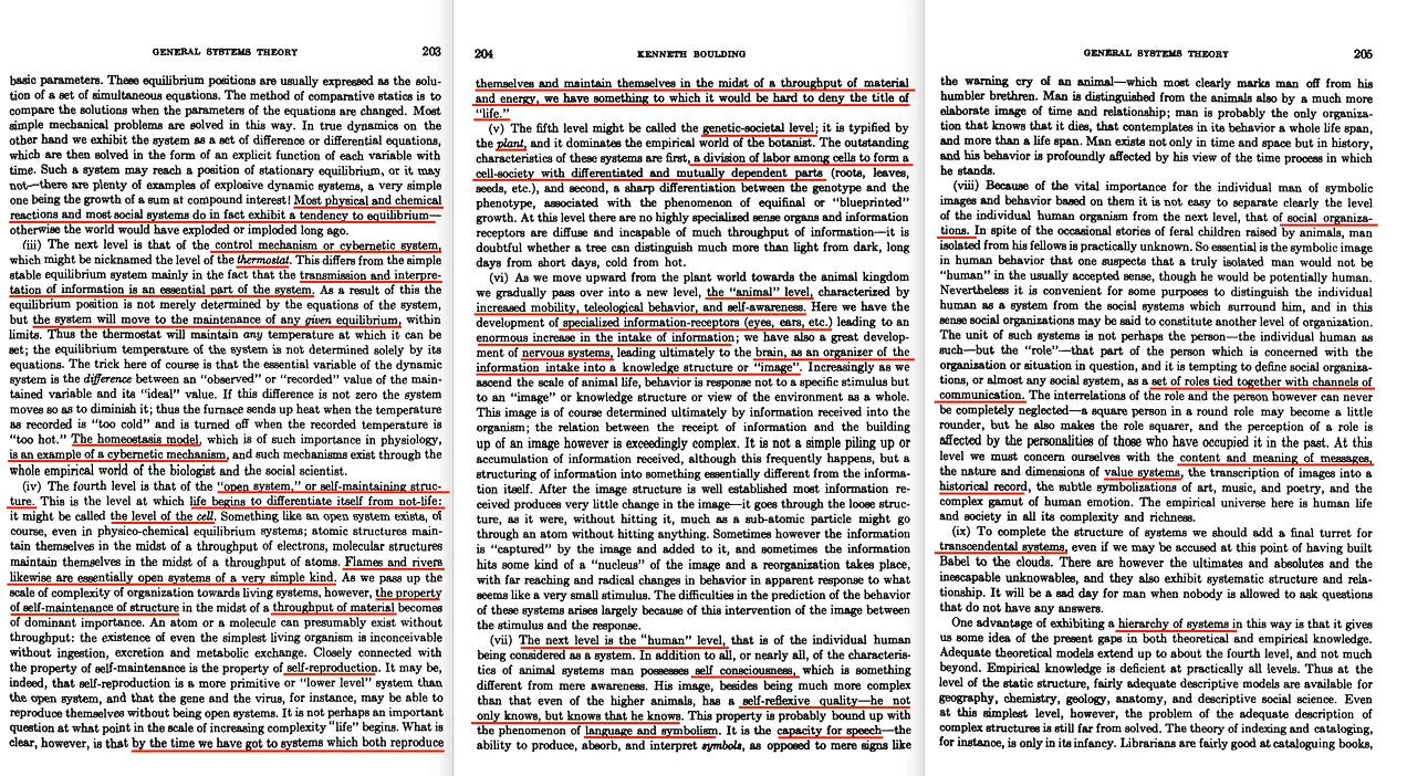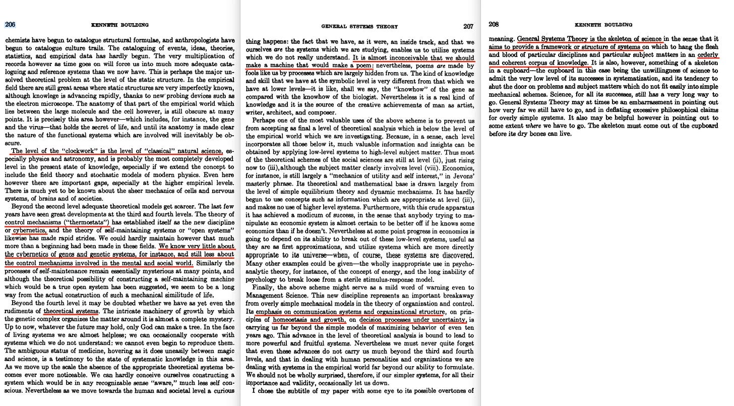 «Πέρα από το δεύτερο επίπεδο, τα επαρκή θεωρητικά μοντέλα γίνονται πιο σπάνια. Τα τελευταία χρόνια έχουν σημειωθεί μεγάλες εξελίξεις στο τρίτο και τέταρτο επίπεδο. Η θεωρία των μηχανισμών ελέγχου («θερμοστάτες») έχει καθιερωθεί ως η νέα επιστήμη της κυβερνητικής, και η θεωρία των αυτοσυντηρούμενων συστημάτων ή «ανοιχτών συστημάτων» έχει επίσης σημειώσει ραγδαία πρόοδο. Ωστόσο, δύσκολα θα μπορούσαμε να υποστηρίξουμε ότι έχει γίνει κάτι περισσότερο από ένα πρώτο βήμα σε αυτούς τους τομείς. Γνωρίζουμε πολύ λίγα για την κυβερνητική των γονιδίων και των γενετικών συστημάτων, για παράδειγμα, και ακόμη λιγότερα για τους μηχανισμούς ελέγχου που εμπλέκονται στον ψυχικό και κοινωνικό κόσμο».