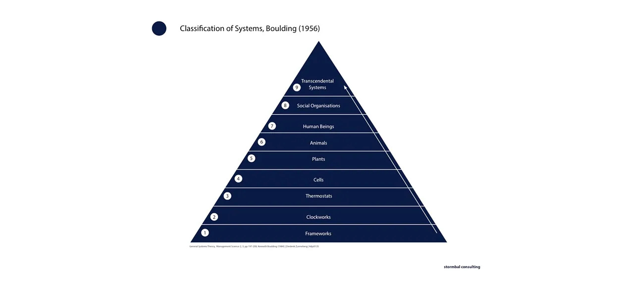 Στη συνέχεια, ο Boulding επιταχύνει την πολυπλοκότητα, αλλά πρώτα ορίζει το εύρος αυτού που μπορεί να περιλαμβάνει το παρατηρούμενο «σύστημα» -