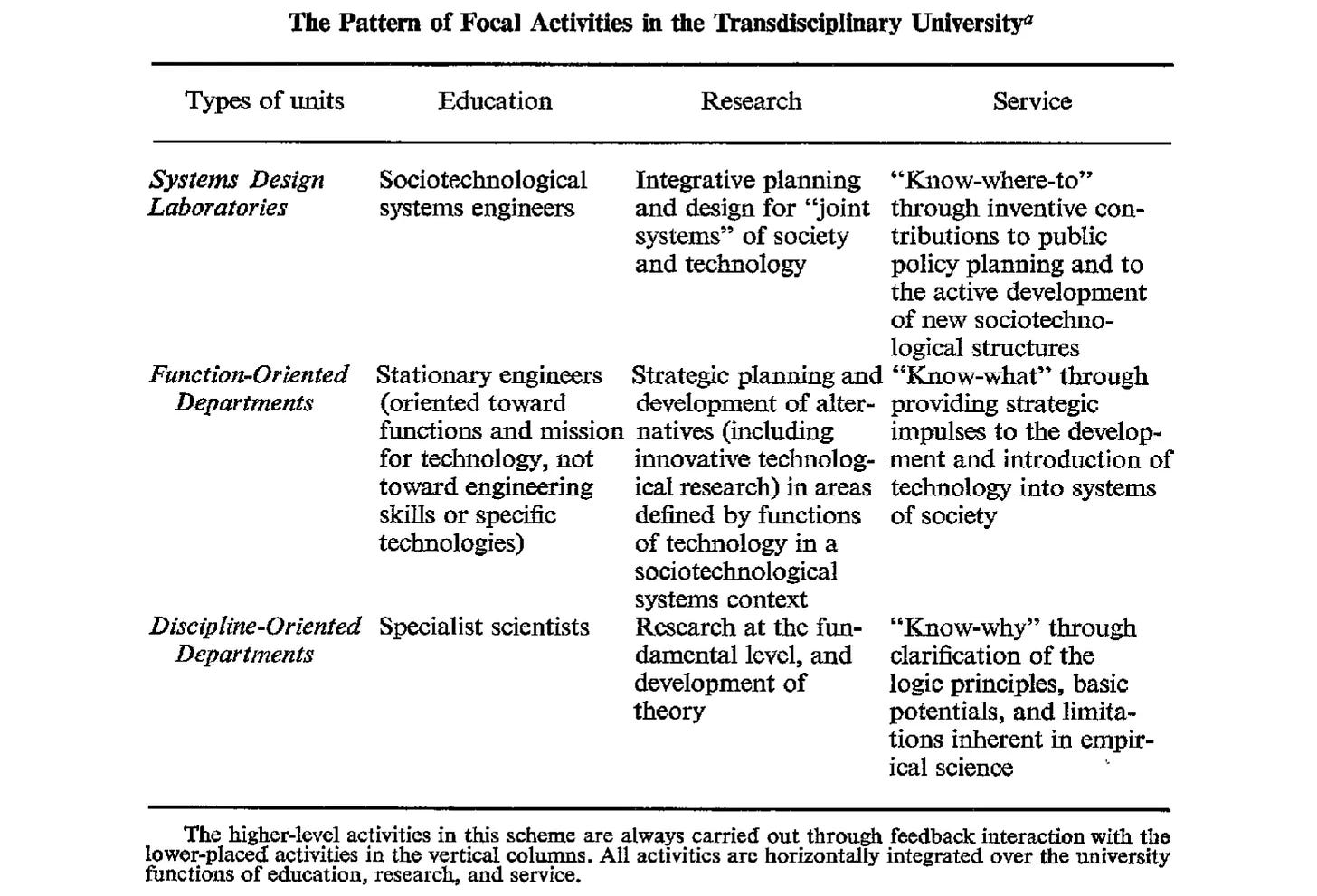 Ο επόμενος πίνακας προσδιορίζει τα τρία επίπεδα της διεπιστημονικής πανεπιστημιακής δομής. Αυτά αποτελούνται από τα τμήματα που είναι προσανατολισμένα προς τις επιστήμες, τα τμήματα που είναι προσανατολισμένα προς τις λειτουργίες και τα εργαστήρια σχεδιασμού συστημάτων. Το άρθρο έχει την ευγενή καλοσύνη να δίνει παραδείγματα για το τι συνεπάγονται αυτά, αν και δεν είναι ιδιαίτερα σημαντικό σε αυτό το στάδιο.