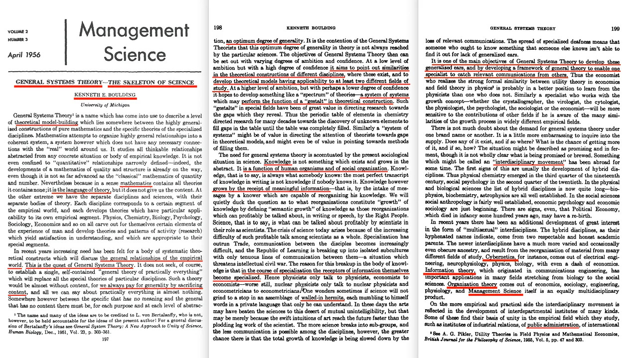 Η Εταιρεία για την Προώθηση της Γενικής Θεωρίας Συστημάτων ιδρύθηκε το 1956 και το εναρκτήριο άρθρο στο πρώτο ετήσιο λεύκωμά της γράφτηκε από τον Kenneth Boulding: Γενική Θεωρία Συστημάτων - Ο Σκελετός της Επιστήμης [1], ο οποίος, παρεμπιπτόντως, ήταν και ο πρώτος πρόεδρος αυτής της εταιρείας [2].