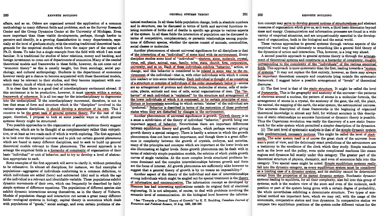 Αλλά ας επιστρέψουμε στο άρθρο. Ο Boulding ξεκινάει εισάγοντας την έννοια του σκελετού της επιστήμης, τον οποίο περιγράφει ως τις θεμελιώδεις αρχές που είναι κοινές σε όλες τα επιστημονικά πεδία. Τονίζει ότι αυτές οι αρχές δεν είναι συγκεκριμένες για κάποιο συγκεκριμένο πεδίο μελέτης, αλλά αντιπροσωπεύουν καθολικούς νόμους ή μοτίβα που διέπουν τα φυσικά φαινόμενα, παραδείγματα των οποίων περιλαμβάνουν τους νόμους της θερμοδυναμικής, τις αρχές της εξέλιξης και την έννοια της ισορροπίας.