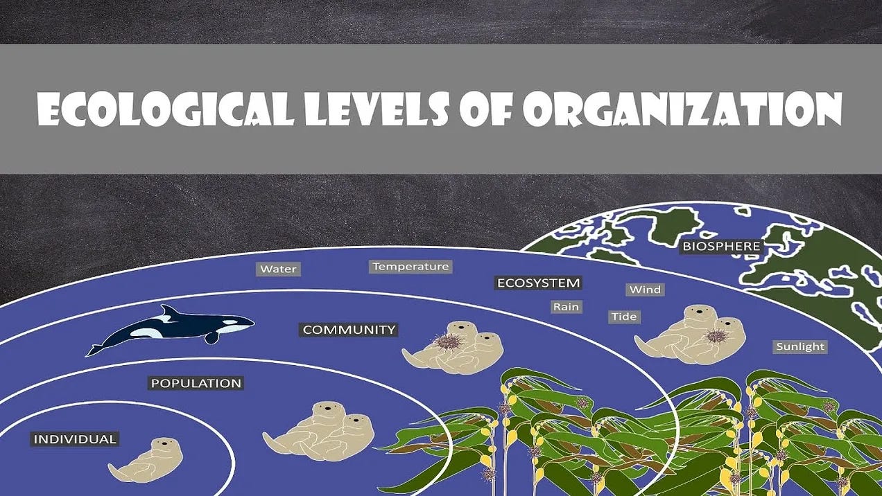 Και μπορούμε να εφαρμόσουμε τις ίδιες αρχές στην οικολογία γενικά, όπου διαπιστώνουμε ότι μια οικολογική οργάνωση αποτελείται από πέντε επίπεδα: οργανισμός, πληθυσμός, κοινότητα, οικοσύστημα και βιόσφαιρα. Και έχουμε δει τους δύο τελευταίους όρους να αναφέρονται επανειλημμένα. Και αυτό σίγουρα δεν είναι τυχαίο - ειδικά σε αυτό το πλαίσιο.