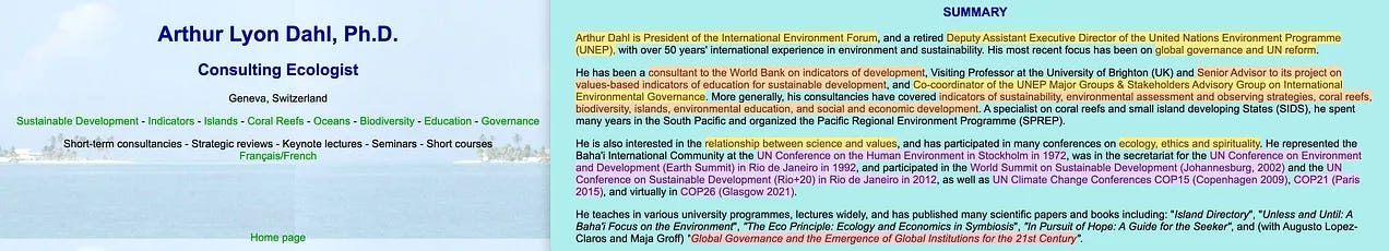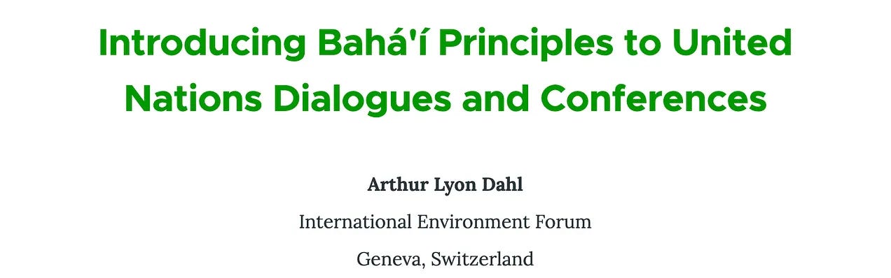 Ο Arthur Lyon Dahl [16] βρίσκεται στη διασταύρωση της διαχείρισης του πλανήτη, της περιβαλλοντικής διακυβέρνησης και της χάραξης παγκόσμιας πολιτικής, γεγονός που τον καθιστά κεντρική προσωπικότητα τόσο στο Διεθνές Περιβαλλοντικό Φόρουμ (IEF) όσο και στον περιβαλλοντικό μηχανισμό των Ηνωμένων Εθνών. Ως πρώην Αναπληρωτής Βοηθός Εκτελεστικός Διευθυντής του UNEP, η σταδιοδρομία του είναι βαθιά ενσωματωμένη στις πρωτοβουλίες για την βιωσιμότητα, τη μεταρρύθμιση της παγκόσμιας διακυβέρνησης και τα ηθικά πλαίσια για τη διαχείριση του πλανήτη. Η εμπειρογνωμοσύνη του εκτείνεται σε δείκτες βιωσιμότητα, βιοποικιλότητα, εκπαίδευση και διακυβέρνηση, με εκτεταμένη συμμετοχή στη Σύνοδο Κορυφής του Ρίο (1992), στη Σύνοδο Κορυφής Ρίο+20 (2012), στην COP15 και στην Παγκόσμια Σύνοδο Κορυφής για την Αειφόρο Ανάπτυξη (2002). Πέρα από την πολιτική του επιρροή, ο Dahl είναι μελετητής του Baha’i, ασχολούμενος με τη σχέση μεταξύ επιστήμης και αξιών, η οποία έχει ενημερώσει την υποστήριξή του για την ενσωμάτωση της ηθικής στην παγκόσμια περιβαλλοντική πολιτική.