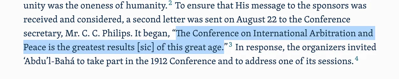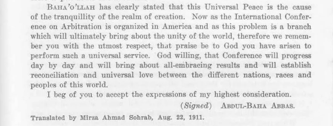 Ας πάμε όμως πίσω στο χρόνο, συγκεκριμένα στη Διάσκεψη του 1912 για τη Διεθνή Διαιτησία και την Ειρήνη [23] , η οποία, όπως περιγράφεται στο απόσπασμα που υπογραμμίζεται, σηματοδοτεί μια σημαντική στιγμή στην εμπλοκή των Bahá’í με την παγκόσμια διακυβέρνηση, δίνοντας έμφαση στην ειρήνη μέσω της διαιτησίας ως θεμελιώδη αρχή. Η πρόσκληση του ‘’Abdu’l-Bahá να μιλήσει στη διάσκεψη υπογραμμίζει την πρώιμη ευθυγράμμιση της πίστης των Bahá’í με τους διεθνείς νομικούς μηχανισμούς επίλυσης συγκρούσεων, μια έννοια που αργότερα θα εξελισσόταν σε σύγχρονα πλαίσια παγκόσμιας διακυβέρνησης. Το γεγονός αυτό τοποθετεί τη σκέψη του Bahá’í μέσα στην ευρύτερη ιστορική κίνηση προς τη δομημένη διεθνή διαιτησία, η οποία θα επηρέαζε αργότερα θεσμούς όπως η Κοινωνία των Εθνών και τα Ηνωμένα Έθνη.