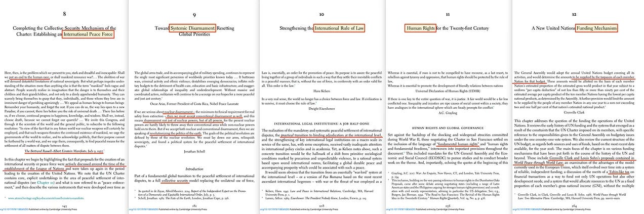 Κρίσιμα, η πρόταση για μια Διεθνή Δύναμη Ειρήνης, σε συνδυασμό με την υποχρεωτική δικαιοδοσία του ΔΠΔ και την υποχρεωτική επιβολή του διεθνούς δικαίου, μετακινεί την παγκόσμια διακυβέρνηση σε ένα μετα-Βεστφαλιανό παράδειγμα, στο οποίο η κυριαρχία υποτάσσεται σε ένα παγκόσμιο νομικό πλαίσιο. Αυτό αποτελεί θεμελιώδη υλοποίηση της εξελικτικής πορείας του Teilhard, όπου τα ανθρώπινα συστήματα προχωρούν προς την αυξανόμενη πολυπλοκότητα και ενότητα, συγκλίνοντας τελικά σε ένα ενιαίο σημείο ηθικής, νομικής και πολιτικής ολοκλήρωσης. Με εμπειριομονιστικούς όρους, αυτό το πλαίσιο δεν είναι απλώς μια πολιτική αναδιοργάνωση αλλά μια επιστημολογική μετατόπιση, όπου οι επιστημονικές και ηθικές «αλήθειες» υιοθετούνται συλλογικά ως μια μοναδική, κυβερνητική πραγματικότητα - μια επέκταση του μονισμού του Bogdanov, αλλά εφαρμοζόμενη σε πλανητική κλίμακα.