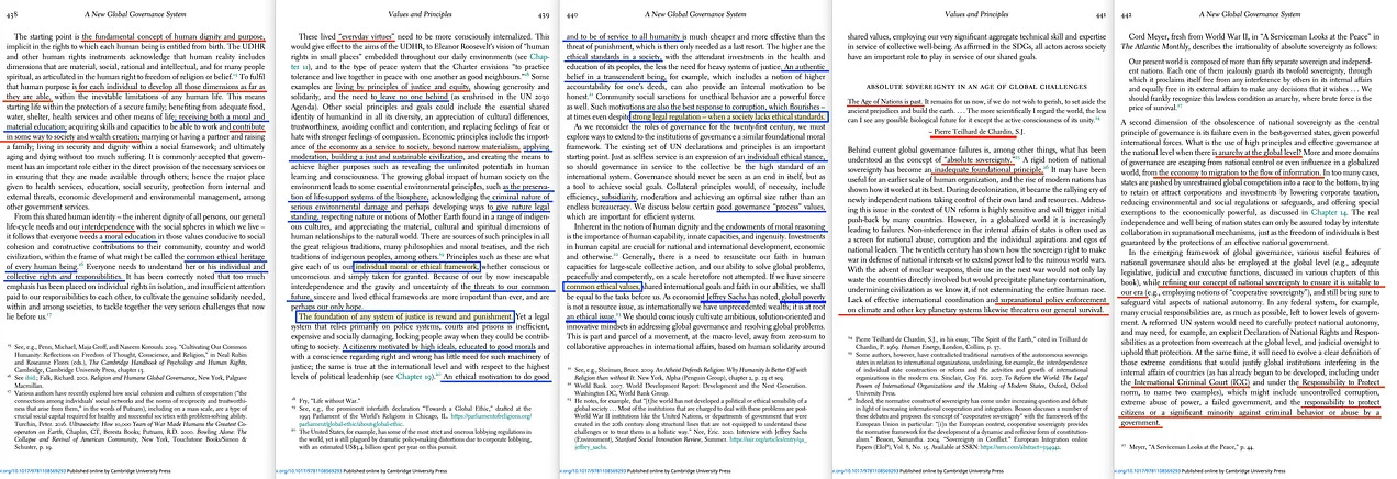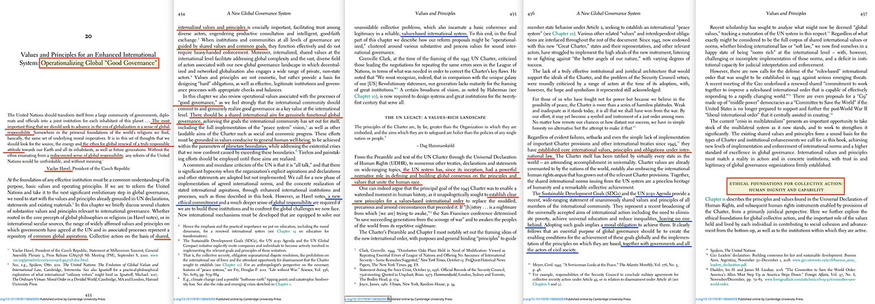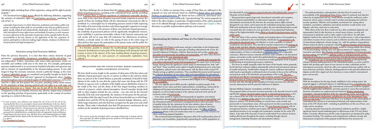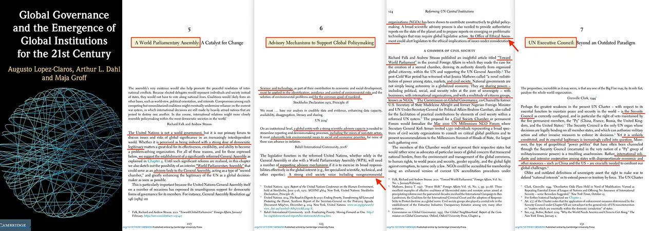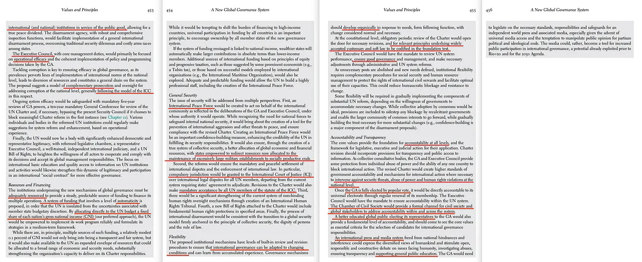 Οι καταληκτικές προτάσεις αντιπροσωπεύουν μια οριστική στροφή προς ένα συγκεντρωτικό μοντέλο παγκόσμιας διακυβέρνησης, που ευθυγραμμίζεται στενά με το όραμα του Ωμέγα Σημείου του Teilhard de Chardin, καθώς και με τον Εμπειριομονισμό και την Τεκτολογία του Bogdanov ως μηχανισμούς συστημικού ελέγχου. Τα Ηνωμένα Έθνη, τοποθετημένα ως πυρήνας αυτής της εξελισσόμενης πλανητικής τάξης, αναλαμβάνουν έναν ολοένα και πιο καθοδηγητικό ρόλο, ενσωματώνοντας οικονομικές, νομικές και εκτελεστικές δυνατότητες που παρακάμπτουν την παραδοσιακή κυριαρχία των εθνών-κρατών. Η πρόταση να διατίθεται ένα σταθερό μερίδιο του Ακαθάριστου Εθνικού Εισοδήματος κάθε έθνους απευθείας στον προϋπολογισμό του ΟΗΕ εξασφαλίζει αέναη οικονομική ανεξαρτησία, επιτρέποντας την απρόσκοπτη παγκόσμια διοίκηση χωρίς εξάρτηση από την εθνική πολιτική βούληση.