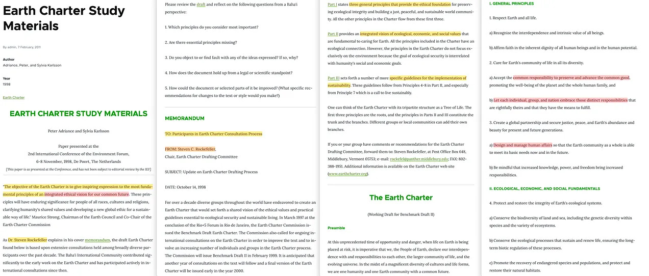 Η έκκληση της Χάρτας της Γης για «σχεδιασμό και διαχείριση των ανθρώπινων υποθέσεων» ευθυγραμμίζεται άμεσα με τις διδασκαλίες των Bahá’í σχετικά με τη διακυβέρνηση, οι οποίες δίνουν έμφαση στην εναρμόνιση των ανθρώπινων συστημάτων με την πλανητική ευημερία μέσω μιας δομημένης αλλά συμβουλευτικής προσέγγισης, που δεν διαφέρει από εκείνη που προωθείται κρυφά μέσω της Ατζέντας 21. Η έννοια ότι κάθε άτομο, ομάδα και έθνος έχει ξεχωριστές ευθύνες αντιστοιχεί στην έννοια της επικουρικότητας του Baha’i, όπου η διακυβέρνηση λειτουργεί στο πιο τοπικό επίπεδο, αλλά μπορεί να παρακαμφθεί από πάνω προς τα κάτω, όταν είναι απαραίτητο. Αυτό διασφαλίζει ότι οι προσπάθειες βιωσιμότητας συντονίζονται υποθετικά σε παγκόσμιο επίπεδο, διατηρώντας παράλληλα την ευελιξία για τοπική προσαρμογή - μια αρχή που η πίστη των Bahá’í υποστηρίζει από καιρό.