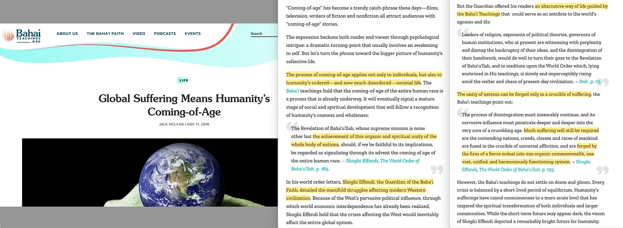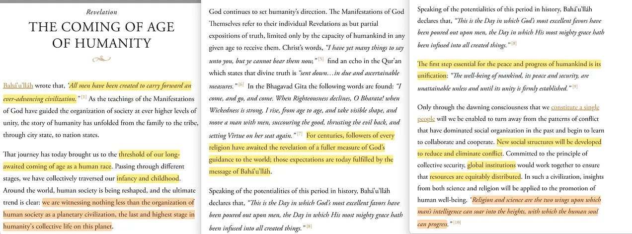 Η ενηλικίωση της ανθρωπότητας είναι μια συλλογική διαδικασία, όχι απλώς ατομική [8]. Το επιχείρημα είναι ότι η τρέχουσα κατάσταση αναταραχής στον κόσμο υποδηλώνει μια μετάβαση προς ένα πιο ενοποιημένο στάδιο ανάπτυξης. Η ενότητα των εθνών θα προκύψει μέσα από τα δεινά, καθώς η αποσύνθεση των παλαιών συστημάτων τελικά θα αναγκάσει την ανθρωπότητα να προχωρήσει προς μια αρμονική, ενοποιημένη τάξη. Ο Shoghi Effendi περιγράφει πώς οι αγώνες του σύγχρονου δυτικού πολιτισμού είναι αλληλένδετοι με τις παγκόσμιες προκλήσεις, υπογραμμίζοντας ότι οι διδασκαλίες του Bahá’í προσφέρουν μια εναλλακτική οδό για να καθοδηγήσουν την ανθρωπότητα μέσα από τις κρίσεις της. Τελικά, παρά τις σκληρές δοκιμασίες που περιμένουν την ανθρωπότητα, αυτές οι δυσκολίες θεωρούνται απαραίτητα βήματα για την επίτευξη ενός ενιαίου, δίκαιου και ολοκληρωμένου παγκόσμιου συστήματος.