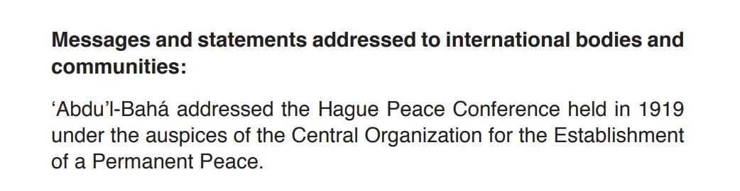 Το 1919, ο Abdu’l-Bahá μίλησε στη Διάσκεψη Ειρήνης της Χάγης [25] υπό την αιγίδα της Κεντρικής Οργάνωσης για την Εγκαθίδρυση Μόνιμης Ειρήνης, ενισχύοντας τη δέσμευση των Baha’i για διεθνή ενότητα και επίλυση των συγκρούσεων [26]. Το μήνυμά του τόνισε ότι η αληθινή ειρήνη απαιτεί περισσότερα από διπλωματικές συμφωνίες - απαιτείται μετασχηματισμός της διακυβέρνησης, της ηθικής και της παγκόσμιας συνεργασίας. Σε ευθυγράμμιση με τις προηγούμενες εκκλήσεις του για διαιτησία, ο Abdu’l-Bahá διαμόρφωσε την ειρήνη ως τον ακρογωνιαίο λίθο μιας δίκαιης παγκόσμιας τάξης, ένα συναίσθημα που βρήκε αργότερα απήχηση σε θεσμούς όπως η Κοινωνία των Εθνών και τα Ηνωμένα Έθνη. Η εμπλοκή του με τη διαδικασία της Χάγης αντανακλά μια πρώιμη και σκόπιμη προσπάθεια να ενσωματώσει ηθικές αρχές στη διεθνή διακυβέρνηση, διαμορφώνοντας τη συζήτηση για την παγκόσμια οικοδόμηση της ειρήνης και την πολυμέρεια στη μετά τον Α’ Παγκόσμιο Πόλεμο εποχή.