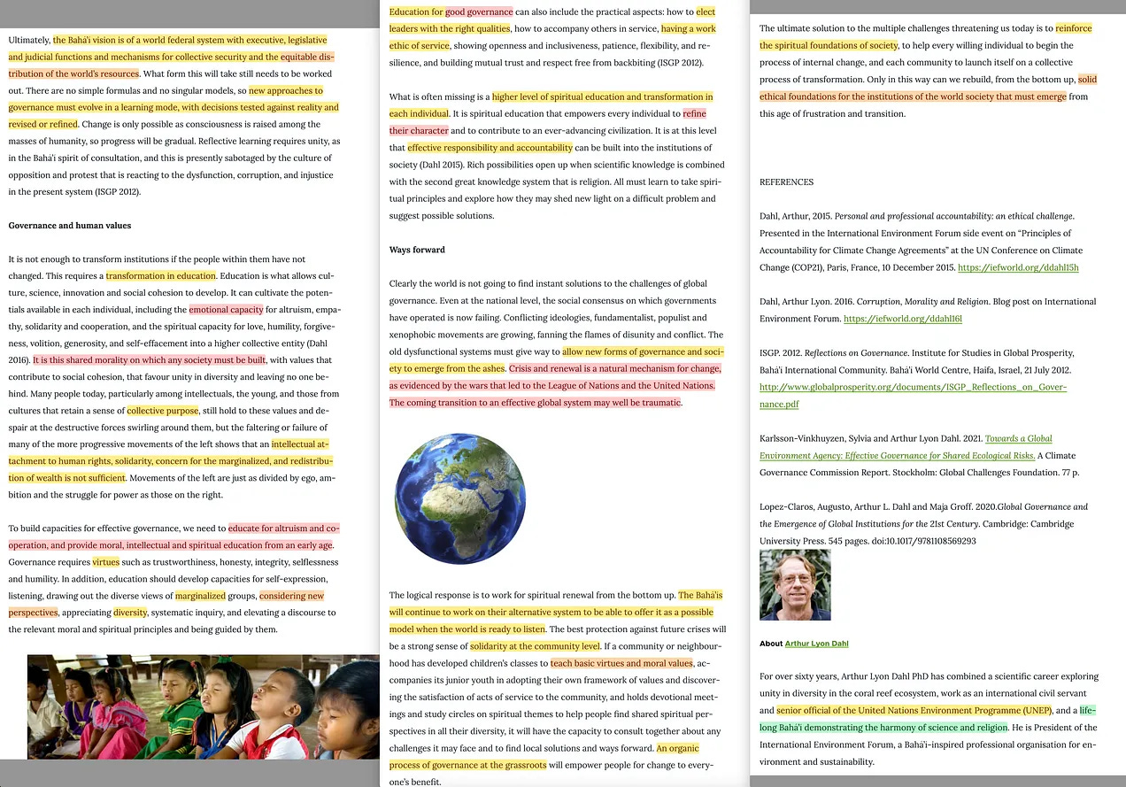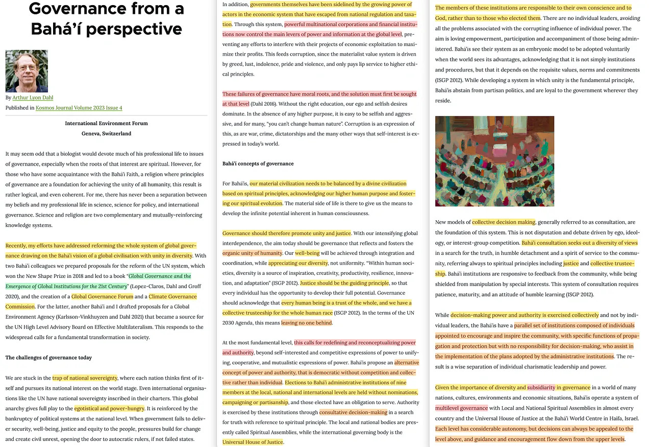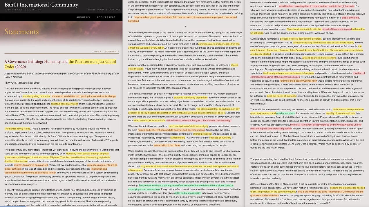 Η έμφαση στη «καλή διακυβέρνηση» είναι βαθιά συνδεδεμένη με την έννοια της παγκόσμιας ευθύνης, της ηθικής συναίνεσης και της πλανητικής ευημερίας. Επισημαίνει την ανάγκη μετάβασης από ένα σύστημα κρατικών συμφερόντων σε ένα σύστημα που βασίζεται σε κοινές ανθρώπινες αξίες, υποστηρίζοντας μια διεθνή τάξη βασισμένη σε κανόνες που δίνει προτεραιότητα στη συλλογική ευημερία έναντι της εθνικής κυριαρχίας. Το όραμα αυτό έχει τις ρίζες του σε ένα παγκόσμιο ηθικό πλαίσιο, τονίζοντας το ρόλο των κοινών προσδοκιών, των πλανητικών ορίων και της διαγενεακής ευθύνης, ενισχύοντας την προοπτική του Baha’i για τη διαχείριση και την ηθική διακυβέρνηση.