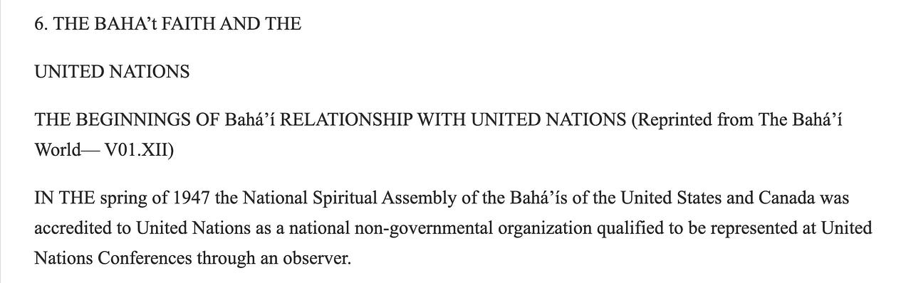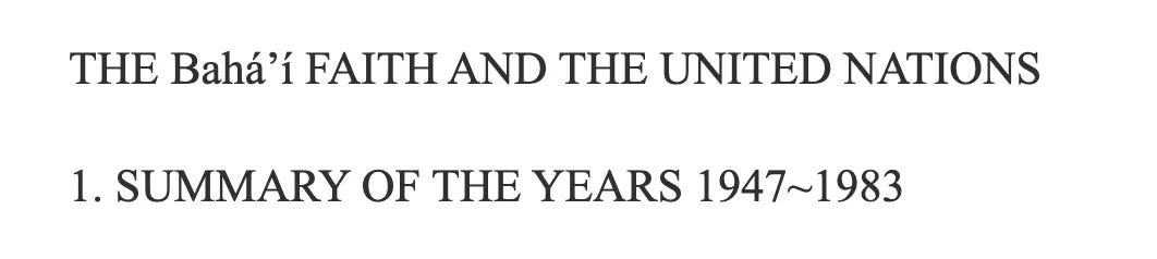 Κατά τη διάρκεια των χρόνων διαμόρφωσης των Ηνωμένων Εθνών [30], η πίστη του Bahá’í εμφανίστηκε ως πρώιμος και ενεργός συμμετέχων στη διαμόρφωση των συζητήσεων για την παγκόσμια διακυβέρνηση, τα ανθρώπινα δικαιώματα και την οικοδόμηση της ειρήνης. Όταν ο ΟΗΕ ιδρύθηκε επίσημα το 1945, εκπρόσωποι του Bahá’í συμμετείχαν ήδη στις ιδρυτικές του διασκέψεις, υποστηρίζοντας τη διεθνή ενότητα και την ηθική διακυβέρνηση. Η Διεθνής Κοινότητα Bahá’í (BIC) απέκτησε επίσημη αναγνώριση ως μη κυβερνητική οργάνωση (ΜΚΟ) το 1948, ευθυγραμμίζοντας την αποστολή της με τις αρχές του ΟΗΕ για τη συλλογική ασφάλεια, τα ανθρώπινα δικαιώματα και την παγκόσμια συνεργασία. Καθ’ όλη τη διάρκεια των πρώτων χρόνων του ΟΗΕ, η κοινότητα Bahá’í επικεντρώθηκε στην προώθηση των πνευματικών και ηθικών διαστάσεων της διακυβέρνησης, τονίζοντας την ανάγκη για ηθική ηγεσία και ένα παγκόσμιο πλαίσιο για τη δικαιοσύνη.