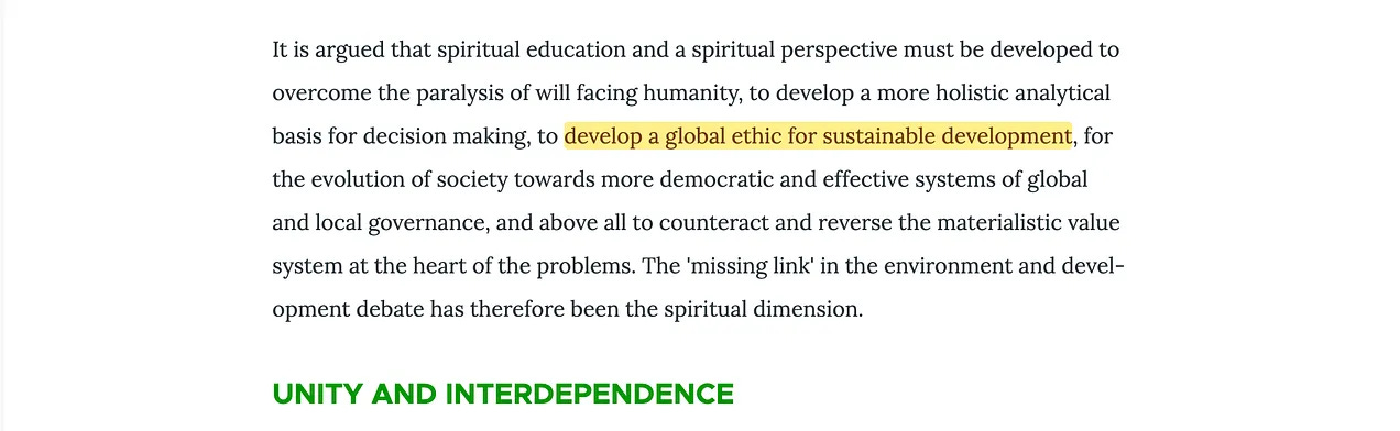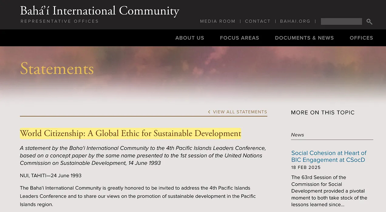 Στο επίκεντρο αυτού του οράματος βρίσκεται η ιδέα της παγκόσμιας ιθαγένειας, την οποία η Πίστη των Bahá’í προωθεί ως θεμελιώδες βήμα προς την παγκόσμια ενότητα και τη διαρκή ειρήνη. Η δήλωση καλεί τους διεθνείς οργανισμούς να υιοθετήσουν πολιτικές που αντανακλούν τη διασύνδεση της ανθρωπότητας και του περιβάλλοντος, τονίζοντας ότι η βιώσιμη ανάπτυξη πρέπει να καθοδηγείται από ηθικές επιταγές και όχι από καθαρά οικονομικά ή πολιτικά κίνητρα. Καλλιεργώντας την αίσθηση της κοινής ευθύνης μεταξύ εθνών, πολιτισμών και κοινοτήτων, η προσέγγιση των Bahá’í επιδιώκει να ενσωματώσει την ηθική διακυβέρνηση στις παγκόσμιες δομές λήψης αποφάσεων - αντικατοπτρίζοντας τις ευρύτερες προσπάθειες για την ενσωμάτωση πλαισίων βασισμένων σε αξίες στην ατζέντα των Ηνωμένων Εθνών για την βιωσιμότητα.