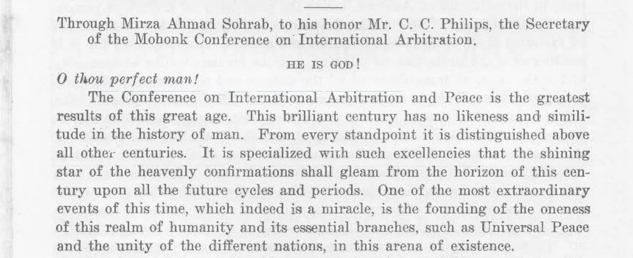 Η συμμετοχή του Abdu’l-Bahá [24] στη Διάσκεψη του Mohonk για τη Διεθνή Διαιτησία το 1911 υπογραμμίζει τη δέσμευση των Baha’i για την παγκόσμια ειρήνη ως διαρθρωτική αναγκαιότητα για την παγκόσμια διακυβέρνηση. Η επιστολή του, που απευθυνόταν στον γραμματέα της διάσκεψης, τοποθετούσε τη διαιτησία και την ειρήνη ως τα καθοριστικά επιτεύγματα της σύγχρονης εποχής. Η αλληλογραφία αυτή τόνιζε ότι η ειρήνη δεν είναι απλώς ένα ιδανικό αλλά μια ενεργή διαδικασία -μια διαδικασία που περιλαμβάνει τη συμφιλίωση, τη συνεργασία και τη δημιουργία διεθνών θεσμών για τη διαμεσολάβηση μεταξύ των εθνών. Υποστηρίζοντας τη διαιτησία, ο Abdu’l-Bahá έθεσε ένα εννοιολογικό θεμέλιο που θα εκδηλωνόταν αργότερα σε πολυμερείς θεσμούς όπως η Κοινωνία των Εθνών και, στη συνέχεια, τα Ηνωμένα Έθνη. Το όραμά του προέβλεπε έναν κόσμο όπου η ηθική διακυβέρνηση και η διεθνής συνεργασία θα αντικαθιστούσαν τις συγκρούσεις, μια αρχή που συνεχίζει να αντανακλάται στο εξελισσόμενο πλαίσιο της παγκόσμιας διακυβέρνησης σήμερα.