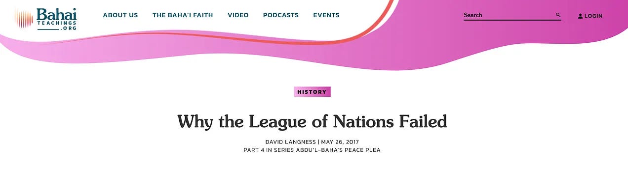 Και η προοπτική του Bahá’í για την Κοινωνία των Εθνών, όπως διατυπώθηκε από προσωπικότητες όπως ο Abdu’l-Bahá και αργότερα ο Shoghi Effendi [27] , ήταν ότι ενώ αντιπροσώπευε ένα σημαντικό βήμα προς τη διεθνή συνεργασία, ήταν τελικά καταδικασμένη να αποτύχει λόγω της έλλειψης πραγματικής εξουσίας και ηθικής ενότητας. Ο Σύνδεσμος, που σχηματίστηκε μετά τον Α’ Παγκόσμιο Πόλεμο για να αποτρέψει μελλοντικές συγκρούσεις, δεν διέθετε μηχανισμούς επιβολής και την απαραίτητη συλλογική βούληση μεταξύ των εθνών για την τήρηση των αρχών του. Οι διδασκαλίες του Bahá’í τόνιζαν από καιρό ότι η αληθινή ειρήνη απαιτούσε θεμέλια δικαιοσύνης, ηθική διακυβέρνηση και μια ενοποιητική πνευματική αρχή - στοιχεία που ο Σύνδεσμος στερούνταν. Ο Shoghi Effendi αργότερα άσκησε κριτική ότι ήταν μια προσωρινή και ατελής προσπάθεια, προβλέποντας ότι ένα πιο ισχυρό και δεσμευτικό σύστημα παγκόσμιας διακυβέρνησης θα αναδυόταν τελικά, ένα όραμα που ευθυγραμμίστηκε με τον μετέπειτα σχηματισμό των Ηνωμένων Εθνών και τις τρέχουσες κινήσεις προς μια δομημένη παγκόσμια τάξη.