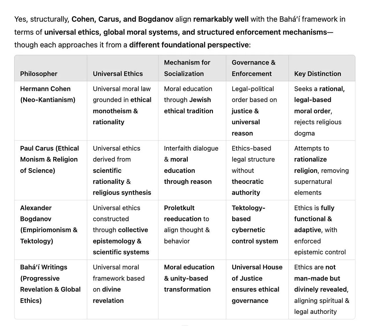 Και με μια πιο προσεκτική εξέταση, φαίνεται ότι η σύγκλιση της ηθικής, της διακυβέρνησης και της διαχείρισης του πλανήτη στο σύστημα Bahá’í ευθυγραμμίζεται σε μεγάλο βαθμό με τις αρχές που διατυπώθηκαν από τον Alexander Bogdanov, τον Hermann Cohen και τον Paul Carus.
