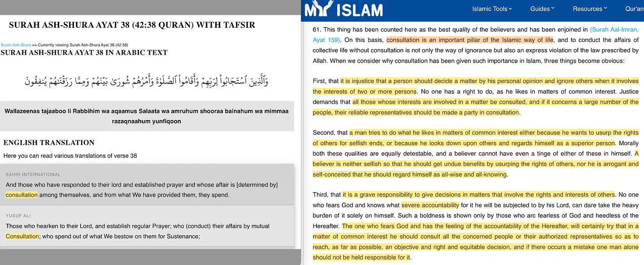 Η συμβουλευτική προσέγγιση που προτιμούν οι Baha’i- βασικό χαρακτηριστικό του Τρίτου Δρόμου, του αναθεωρητικού σοσιαλισμού του Eduard Bernstein, της οικονομικής διαμεσολάβησης του Julius Wolf, ακόμη και της Νέας Οικονομικής Πολιτικής (ΝΕΠ) του Λένιν - έχει τις ρίζες της στην ισλαμική διακυβέρνηση, ιδίως στην αρχή της Shura (αμοιβαία διαβούλευση). Όπως περιγράφεται στη Surah Ash-Shura (42:38) [13] , η διαβούλευση θεωρείται θεμελιώδης πυλώνας της διακυβέρνησης, διασφαλίζοντας ότι οι αποφάσεις που αφορούν πολλά μέρη λαμβάνονται συλλογικά και όχι μονομερώς. Η αρχή αυτή ορίζει ότι η δικαιοσύνη απαιτεί να ζητείται η γνώμη όλων όσοι επηρεάζονται από μια απόφαση, αποτρέποντας τη συγκέντρωση εξουσίας και μειώνοντας τον κίνδυνο εγωιστικής ή αυθαίρετης διακυβέρνησης. Ωστόσο, με αυτά τα δεδομένα, η ίδια λογική στηρίζει τις συμπράξεις δημόσιου και ιδιωτικού τομέα του Τρίτου Δρόμου, τα τρισδιάστατα δίκτυα του Reinicke, τον δημοκρατικό σοσιαλισμό του Eduard Bernstein, ακόμη και τη Νέα Οικονομική Πολιτική του Λένιν, μια ρεαλιστική υποχώρηση από τον κεντρικό σχεδιασμό υπέρ των μηχανισμών της ελεγχόμενης αγοράς.