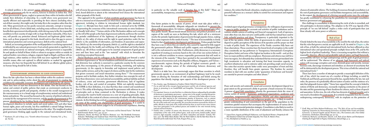 Προσθέτει επίσης πώς η λογοδοσία, η διαφάνεια και το κράτος δικαίου αποτελούν θεμελιώδεις αρχές της χρηστής διακυβέρνησης, ευθυγραμμιζόμενες στενά με τις υπάρχουσες δομές παγκόσμιας διακυβέρνησης, συμπεριλαμβανομένων εκείνων που προωθούνται από την Παγκόσμια Τράπεζα, το ΔΝΤ, την ΕΕ και τις εθνικές κυβερνήσεις. Αυτές οι αρχές -που είναι ήδη ενσωματωμένες στη χρηστή κυβερνητική διακυβέρνηση, την εταιρική διακυβέρνηση και τη διακυβέρνηση της κοινωνίας των πολιτών- αποτελούν τη ραχοκοκαλιά του μοντέλου διακυβέρνησης δημόσιου-ιδιωτικού τομέα (ΣΔΙΤ) και των οργανώσεων της κοινωνίας των πολιτών. Η λογοδοσία διασφαλίζει ότι η διακυβέρνηση είναι δίκαιη και ισότιμη, αποτρέποντας την κατάληψη της εξουσίας από τις ελίτ, ενώ η διαφάνεια μετριάζει τη διαφθορά και προάγει την εμπιστοσύνη. Το κράτος δικαίου τονίζεται ως ο μηχανισμός που εξασφαλίζει δίκαιη απονομή δικαιοσύνης, προβλέψιμα νομικά πλαίσια και μηχανισμούς επιβολής για τη διατήρηση της σταθερότητας και της οικονομικής ασφάλειας.
