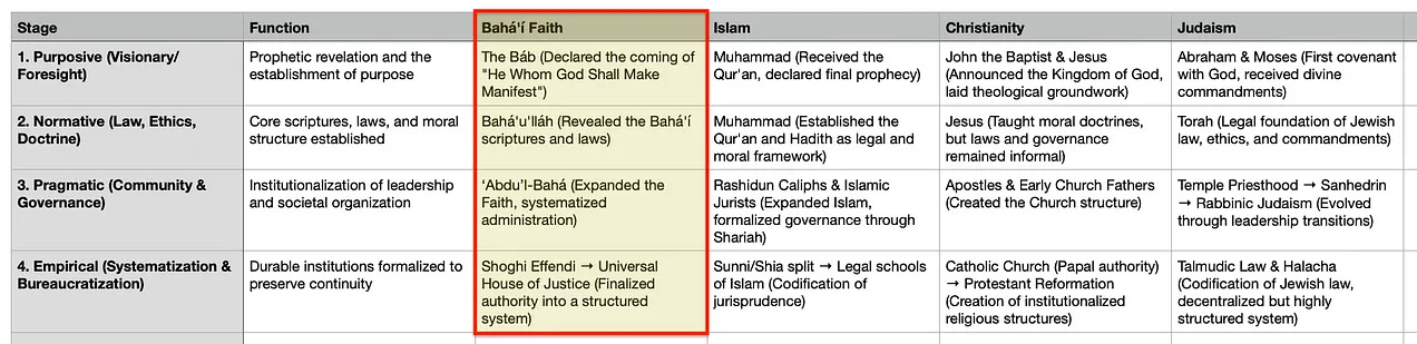 Ας ξεκινήσουμε με μια πολύ σύντομη περιγραφή των τεσσάρων βασικών αγγελιοφόρων της Πίστης Baha’i. Ο Báb [2] περιέγραψε τον σκοπό και έδρασε ως πρόδρομος του Bahá’u’lláh [3], ο οποίος ήταν ο προφήτης, ο θεϊκός εκπαιδευτικός και ιδρυτής της Πίστης Bahá’í. Στη συνέχεια ήρθε ο ‘Abdu’l-Bahá [4], ο οποίος καθιέρωσε τη νομική και διοικητική δομή, και τέλος, ο Shoghi Effendi [5] εξασφάλισε τη δημιουργία του Παγκόσμιου Οίκου Δικαιοσύνης και έδωσε ζωή στον οργανισμό. Και αν αυτό φαίνεται να συνάδει με τον Erich Jantsch, με το σκόπιμο, κανονιστικό, πραγματιστικό και εμπειρικό που περιγράφεται με τη σειρά, εδώ είναι η άποψη του ChatGPT [6]...