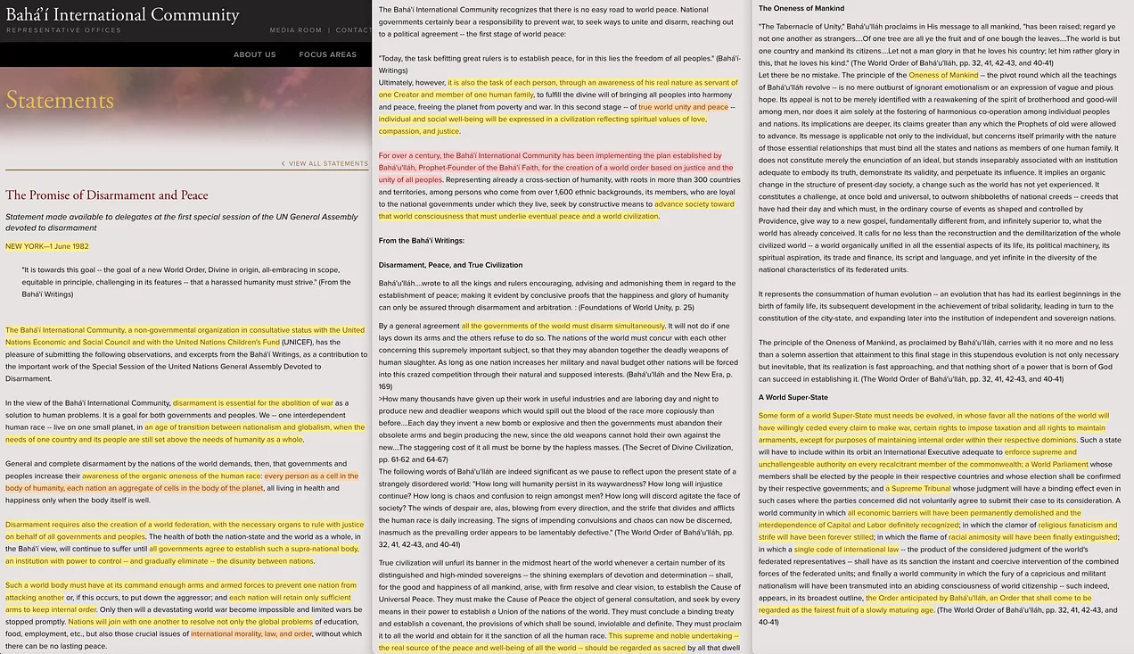 Ενισχύει περαιτέρω την ενσωμάτωση των βασικών αρχών της παγκόσμιας διακυβέρνησης, δίνοντας έμφαση στην επιβολή της διεθνούς ειρήνης, τον συστημικό αφοπλισμό, το κράτος δικαίου, τα ανθρώπινα δικαιώματα και τους κεντρικούς μηχανισμούς χρηματοδότησης. Ευθυγραμμίζεται πλήρως με την ευρύτερη ατζέντα του ΟΗΕ, υποστηρίζοντας μια διεθνή ειρηνευτική δύναμη που θα αντικαταστήσει τους εθνικούς στρατούς, μια καθολική διαδικασία αφοπλισμού πέραν των πυρηνικών δυνάμεων και ένα ισχυρότερο κράτος δικαίου σε διεθνές επίπεδο για τη διακυβέρνηση των συγκρούσεων και την επιβολή της δικαιοσύνης. Η ενσωμάτωση των ανθρωπίνων δικαιωμάτων ως ακρογωνιαίος λίθος της διακυβέρνησης υπογραμμίζει την ευθυγράμμισή της με το μακροχρόνιο πλαίσιο του ΟΗΕ, ενώ ο προτεινόμενος μηχανισμός χρηματοδότησης του ΟΗΕ -με βάση τις αναλογικές συνεισφορές των κρατών μελών- υποδηλώνει ένα οικονομικό μοντέλο που έχει σχεδιαστεί για τη διατήρηση της παγκόσμιας διακυβέρνησης μέσω μιας κεντρικής οικονομικής δομής. Οι προτάσεις αυτές αντικατοπτρίζουν μια απρόσκοπτη συνέχιση της ατζέντας της παγκόσμιας διακυβέρνησης, ενσωματώνοντας την ασφάλεια, το δίκαιο, τα ανθρώπινα δικαιώματα και τους οικονομικούς μηχανισμούς σε ένα ενιαίο σύστημα, ενισχύοντας περαιτέρω το όραμα των Bahá’í για μια ηθικά διαχειριζόμενη παγκόσμια τάξη.