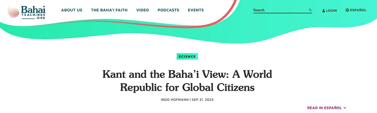 Και ολόκληρο το θεμέλιο του παγκόσμιου πλαισίου ηθικής -η καθολική ηθική δομή που στηρίζει τη διακυβέρνηση, την βιωσιμότητα και την πλανητική διαχείριση- στηρίζεται στη νεοκαντιανή ιδεολογία [35]. Όπως διερευνάται στο βιβλίο: Kant and the Bahá’í View: A World Republic for Global Citizens ( Ο Καντ και η άποψη του Bahá’í: Μια Παγκόσμια Δημοκρατία για Παγκόσμιους Πολίτες), οι διδασκαλίες του Baha’i ευθυγραμμίζονται στενά με το όραμα του Καντ για μια παγκόσμια ηθική τάξη που διέπεται από τη λογική και το καθήκον. Όπως ακριβώς ο Καντ οραματίστηκε ένα νομικό-πολιτικό σύστημα θεμελιωμένο στην παγκόσμια ηθική, η σκέψη των Bahá’í επεκτείνει αυτό το όραμα στις σύγχρονες δομές, ενισχύοντας την ιδέα ότι η παγκόσμια ηθική πρέπει να κωδικοποιηθεί στη διακυβέρνηση για να εξασφαλιστεί η δικαιοσύνη, η βιωσιμότητα και η παγκόσμια ενότητα.